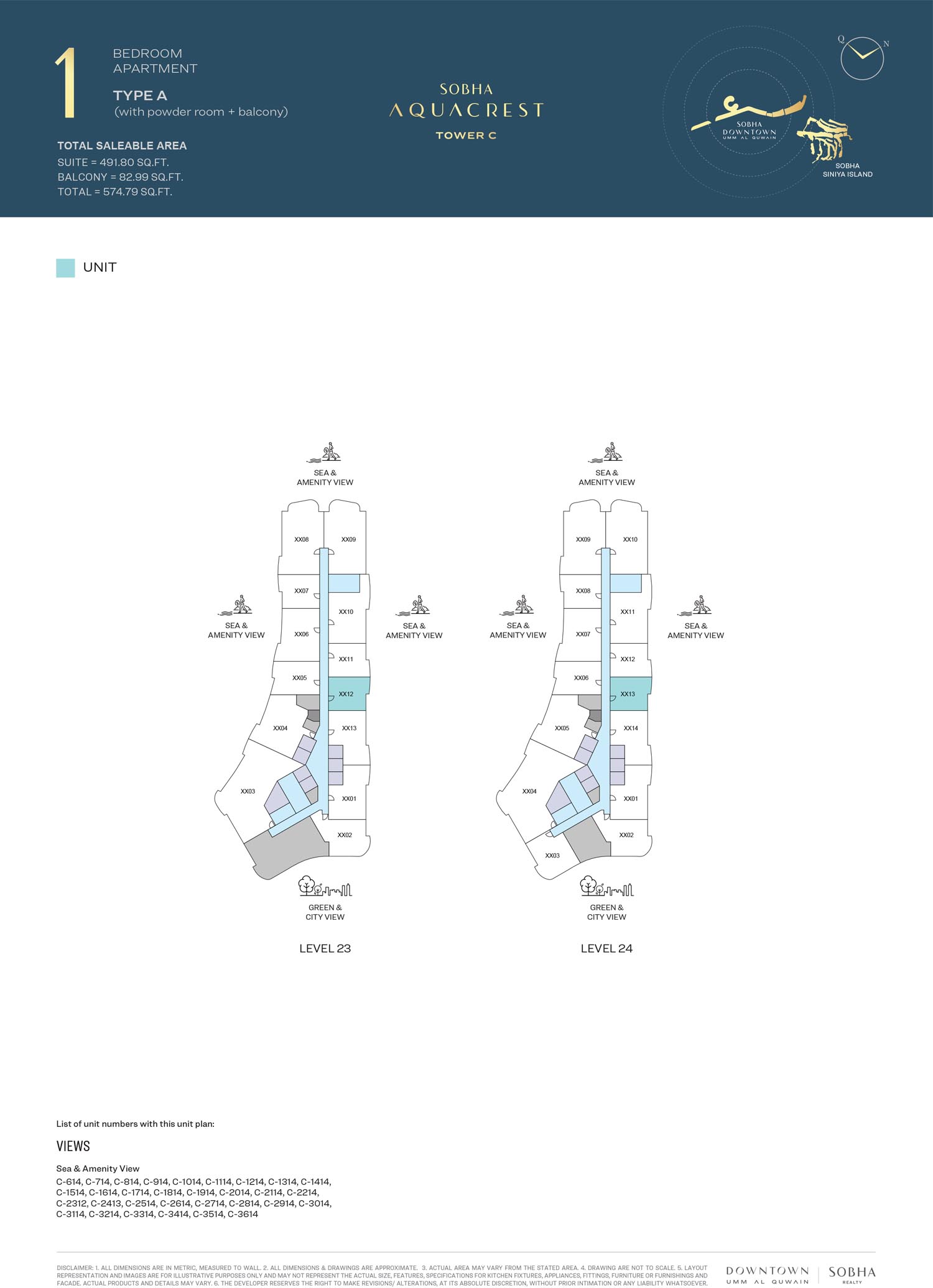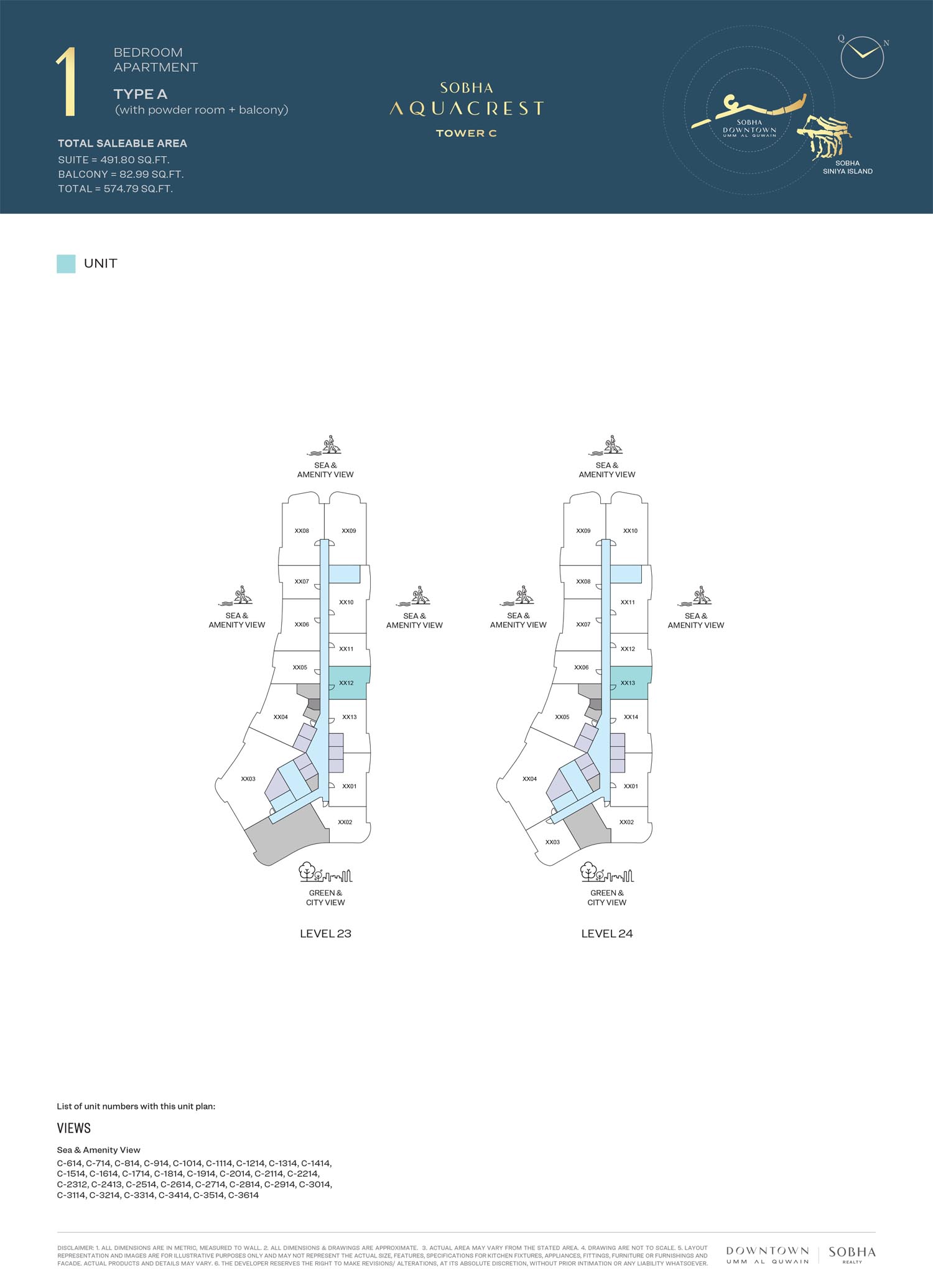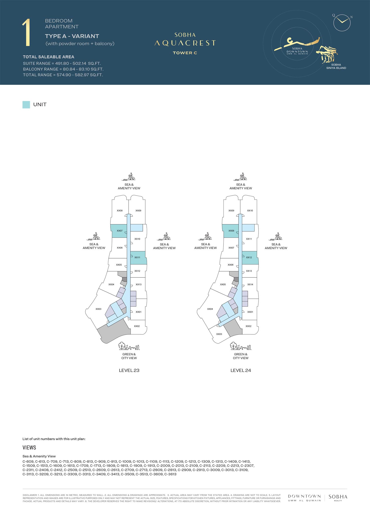 | Tower C | 1 Bedroom | Level 23-24 (Type A Variant) | 574.97 Sq Ft | Click Here |