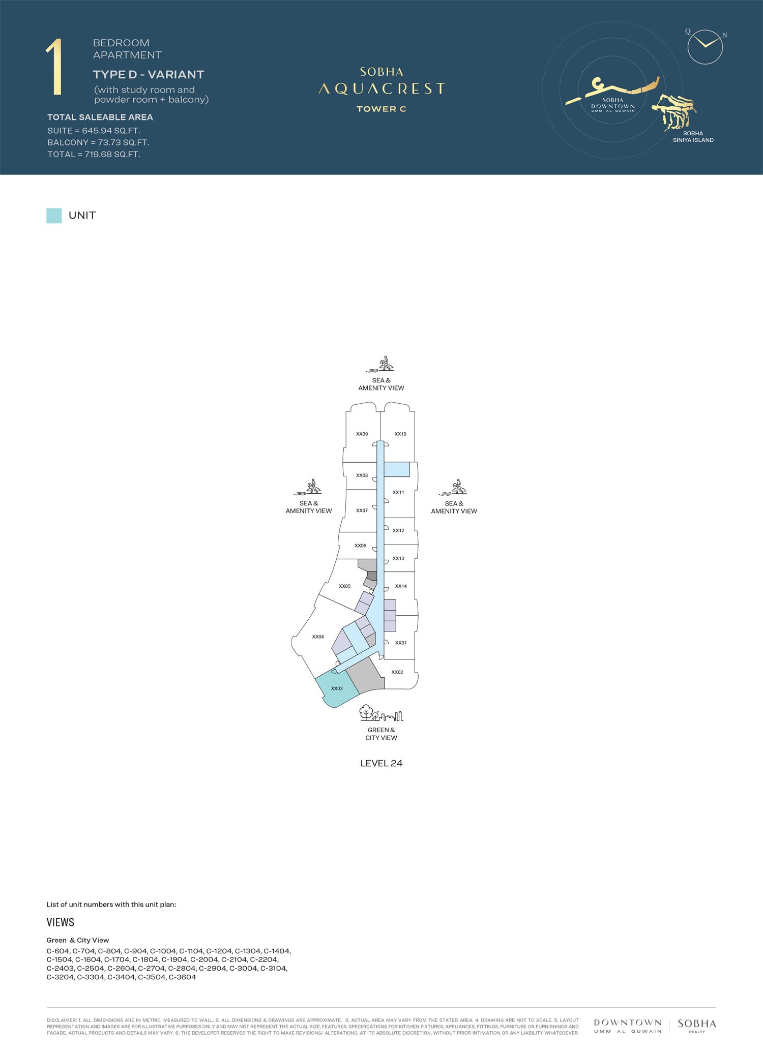 | Tower C | 1 Bedroom | Level 24 (Type D Variant) | 719.68 Sq Ft | Click Here |