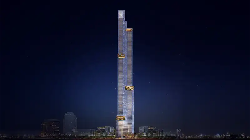 - Rising 450 metres above Sheikh Zayed Road, with 108-storeys stands as a sculptural landmark with a slender twin-block design that reflects both clouds and city lights.