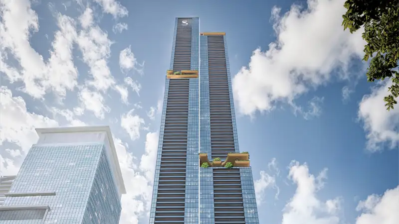 The facade is defined as a thin sculpted surrealistic shape, which will rise approximately 450 metres. Its shape is consciously graceful: two connected blocks the lines of which are made of glass-refracting clouds, and the proportions which are measured as calm and dignified in a bustling skyline. The compositional approach of the building is regarding the visual rhythm and vertical breathing, the park zone themselves, four vertical gardens six-story-high, are placed in the building as a purposeful interruption of the elevation, providing depth, shadow and greenery apparently on high of the street. These superimposing volumes of garden are not merely decorative: they serve as the social lungs of the tower and weave together communal life into the building and allows residents to experience nature, movement and relaxation at heights.