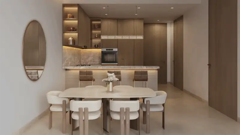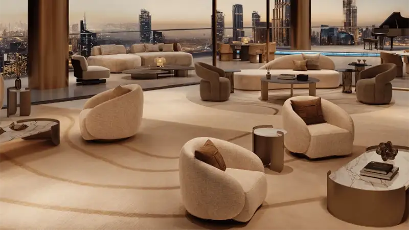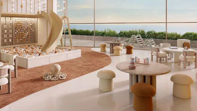 The upper section of this epitome features residential units on 28 to 62 floors. Here, all the two & three-bedroom homes have study rooms with a grand typology of sizes. The insides of all units are blessed with aesthetic and simple yet functional layouts with soft and neutral polished tones. The minimalistic furnishings, premium textures, quality fittings and fixtures in rooms enhance functionality and a life of peaceful comfort. The floor-to-ceiling windows in the living and bedrooms frame the unparalleled views of the Burj Khalif cityscape and the coast of the Gulf water. With over a dozen amenities, there are amenities dedicated only to the residents. This includes a swimming pool, indoor & outdoor gyms, yoga zone, sunken seats, sun loungers, spa, & changing rooms for effortless relaxation and soothing recreation of the natives.