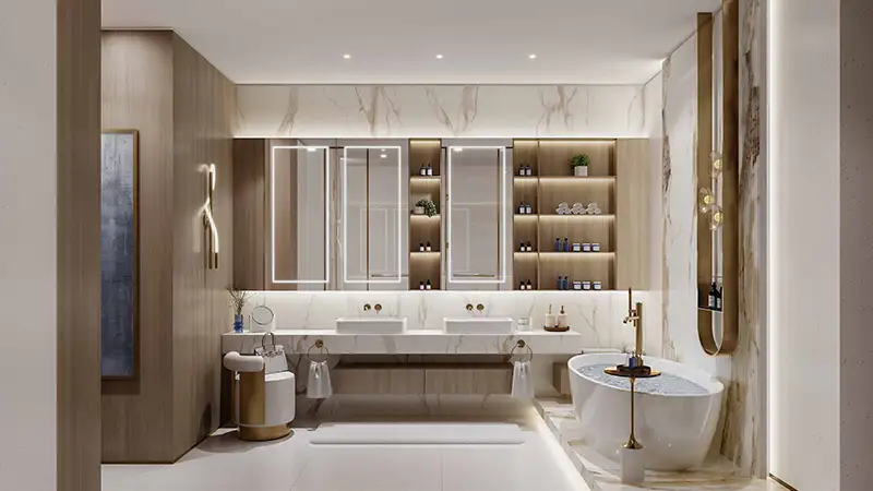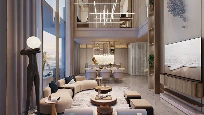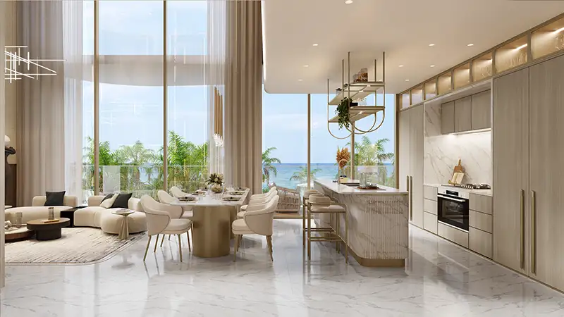 There are 32 units in both types of one & two-bedroom abodes and only 2 units on the top floor come with 3-bedroom penthouses with a maid room in each. The interiors of each residence offer the finest retreats to relax, refresh, rejoice and thrive in the unparalleled family-focused lifestyle. Each unit is characterised by open-design layouts, warm, soft and textured tones, finishes & subtle detailing, while furnished living spaces and integrated kitchen and dining zone, every corner is bathed in sunlight via floor-to-ceiling windows. Bedrooms with double-height ceilings, comfy elements and windows that open to the spacious balconies that frame sweeping scenery of the sea, sun, sky and surroundings.