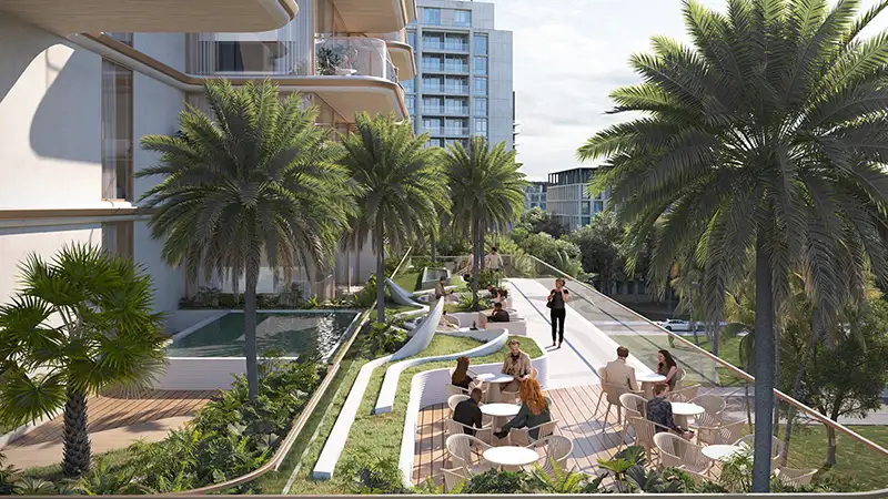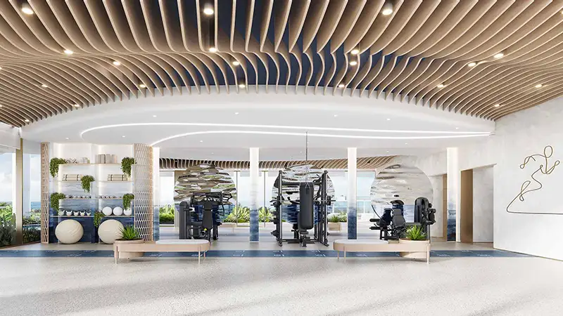 - Relaxation and socializing options of seating zone, meeting area, outdoor cinema, water lounges, outdoor shower, yoga area, gym and floating islands