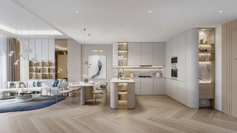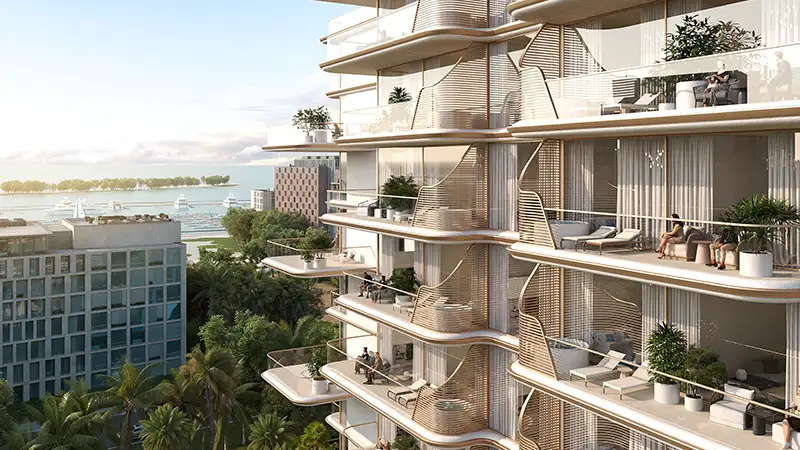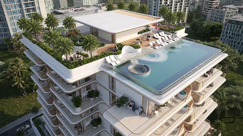 Derived attentively, the alluring architectural masterpiece exquisitely blends the shoreside beauty with modern excellence. Introducing the upscale living by the shimmering waterfront destination, each material of this striking exterior, including meticulously aligned balconies, terrace and landscaped podiums, is designed to enhance the calm & activeness of the island in everyday elevated living. This bespoke complex incorporates a ground, 2 parking podiums, 8 residential floors and a rooftop area full of leisure, relaxation, convenient and restful spaces and features.