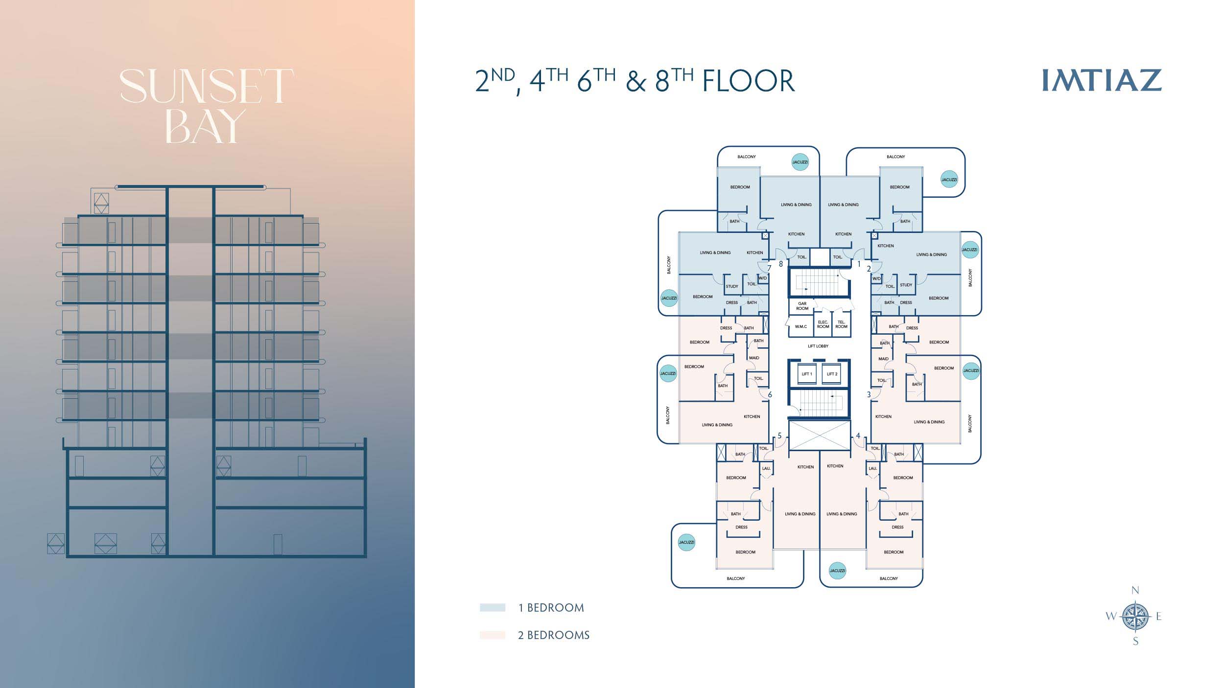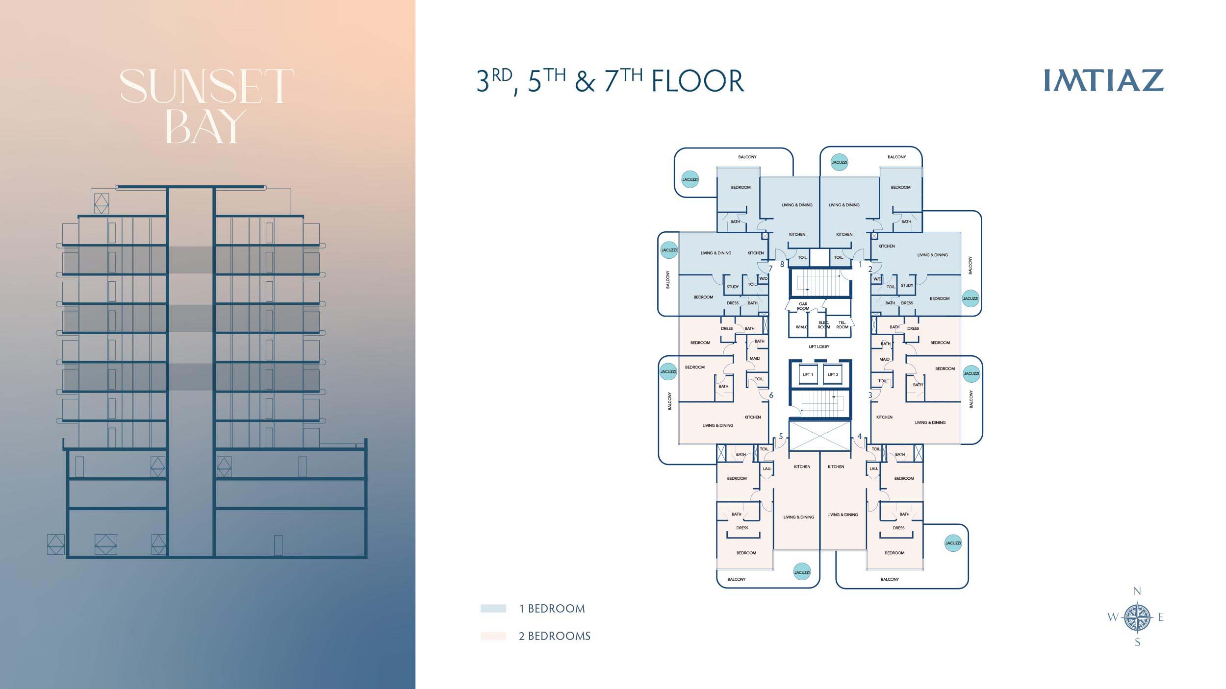 A 10-storey modern residential icon of Sunset Bay exposes floor plans of premium sea-facing 1 & 2-bedroom apartments and 3-bedroom penthouses at Dubai Islands. All apartments in this expensive complex come with double-height ceilings in open-layout all rooms. The floor-to-ceiling windows ensure the sun-lit calm interiors with picturesque vistas of the sun, sea and the vibrant locality. The additional 2 penthouses with a maid’s room in both offer spectacular living in the sky of the vibrant island.