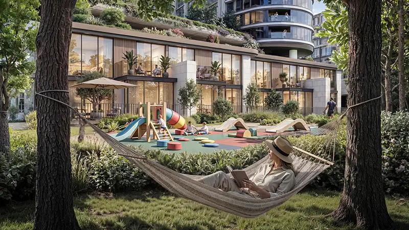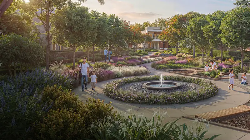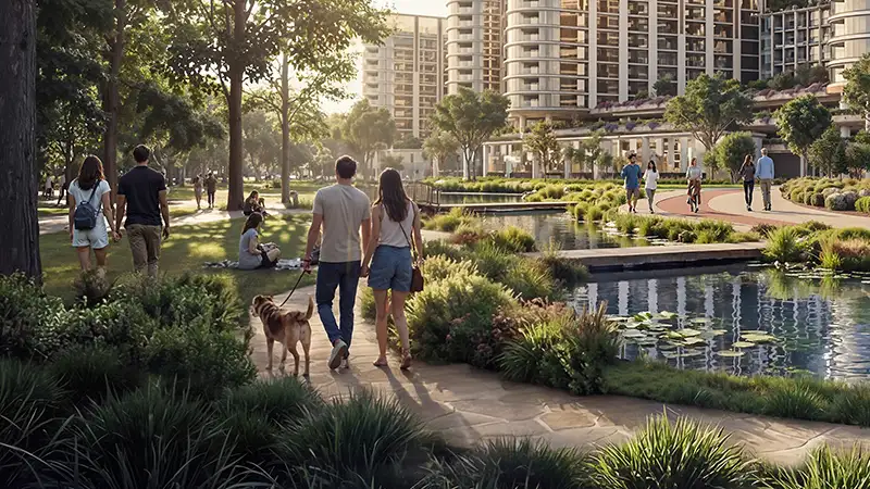 - Located along the central green spine, offers uninterrupted access to landscaped corridors, parks, and shaded walking trails.
