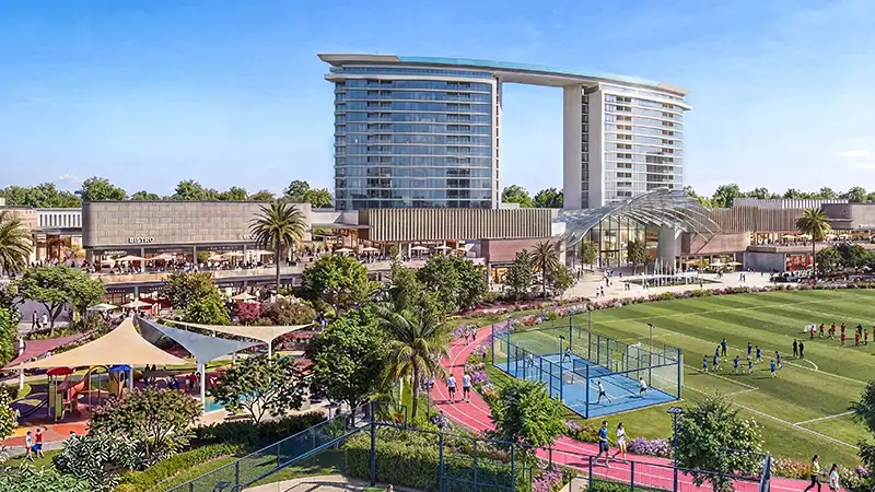 - Wellness is integrated through dedicated fitness loops, outdoor sports courts, meditation lawns, and holistic health spaces.