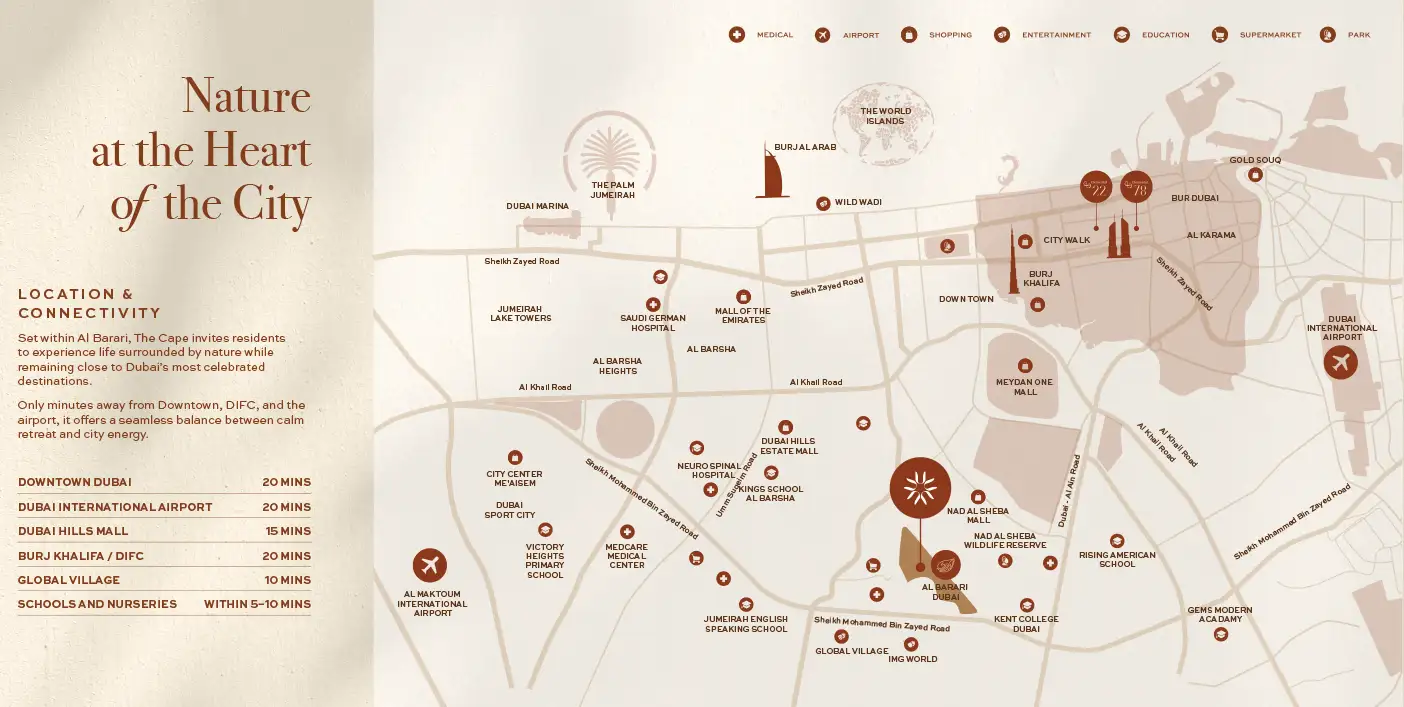 - Located in the heart of Al Barari, offering nature-led living with effortless connectivity to Downtown Dubai, DIFC, major malls, and airports.