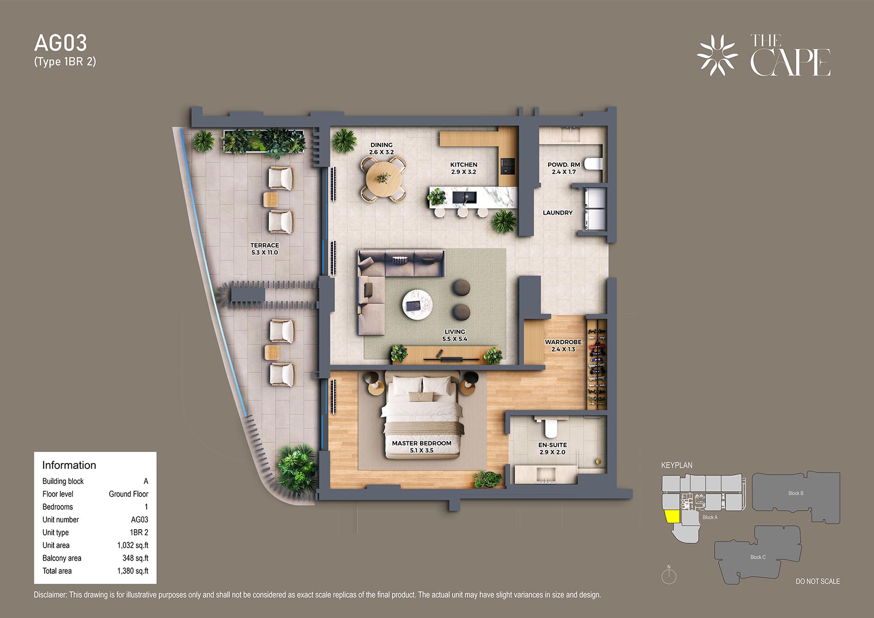 | Block A | 1 Bedroom | Ground Floor Unit-AG03 (Type 1BR 2) | 1380.00 Sq Ft | Click Here |