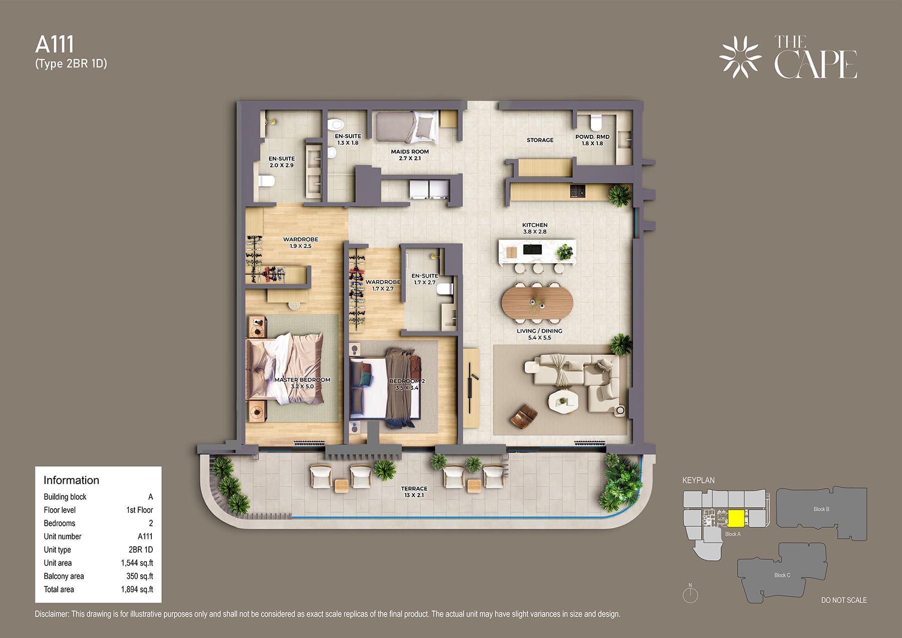 | Block A | 2 Bedrooms + Maid | 1st Floor Unit-A111 (Type 2BR 1D) | 1894.00 Sq Ft | Click Here |
