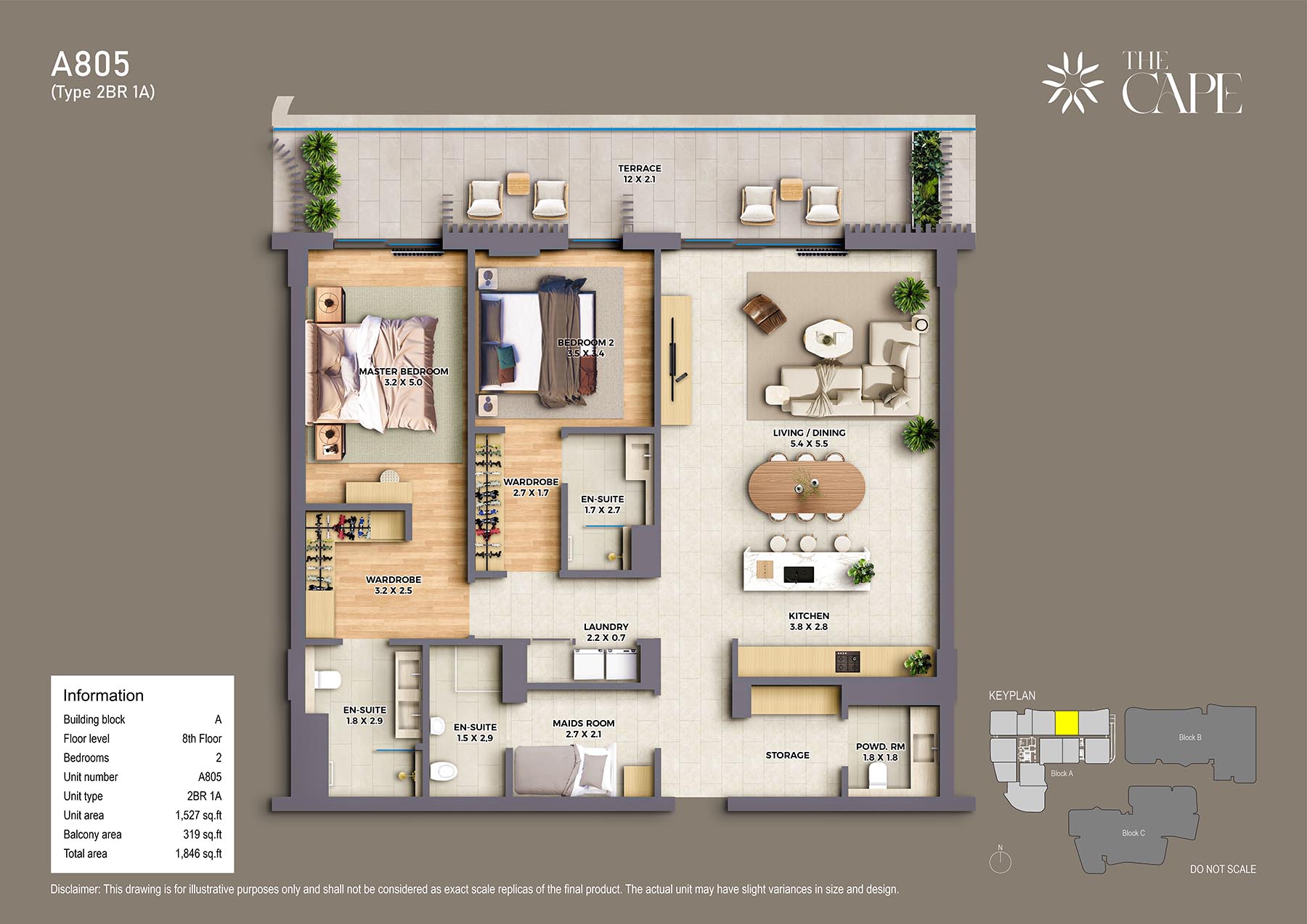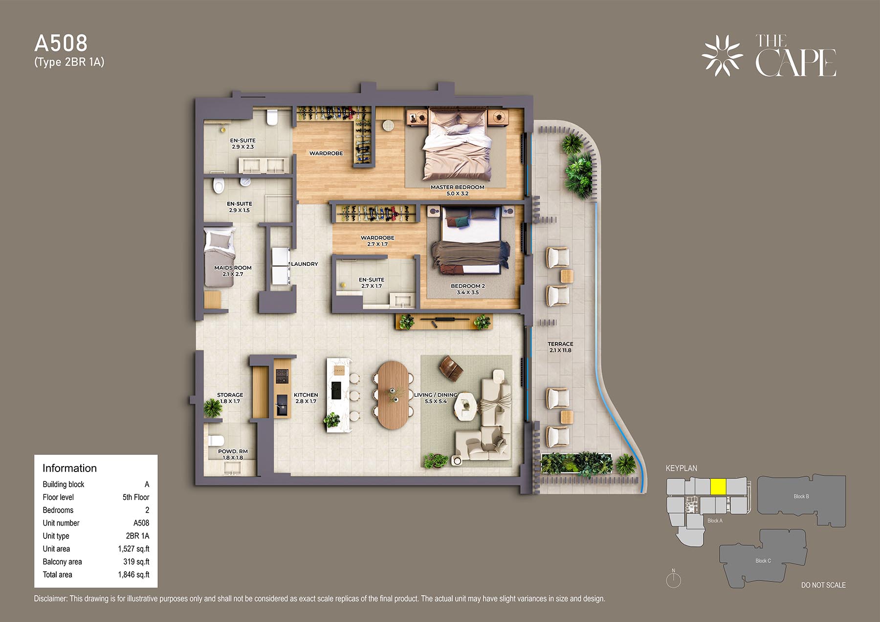 | Block A | 2 Bedrooms + Maid | 8th Floor Unit-A805 (Type 2BR 1A) | 1846.00 Sq Ft | Click Here |