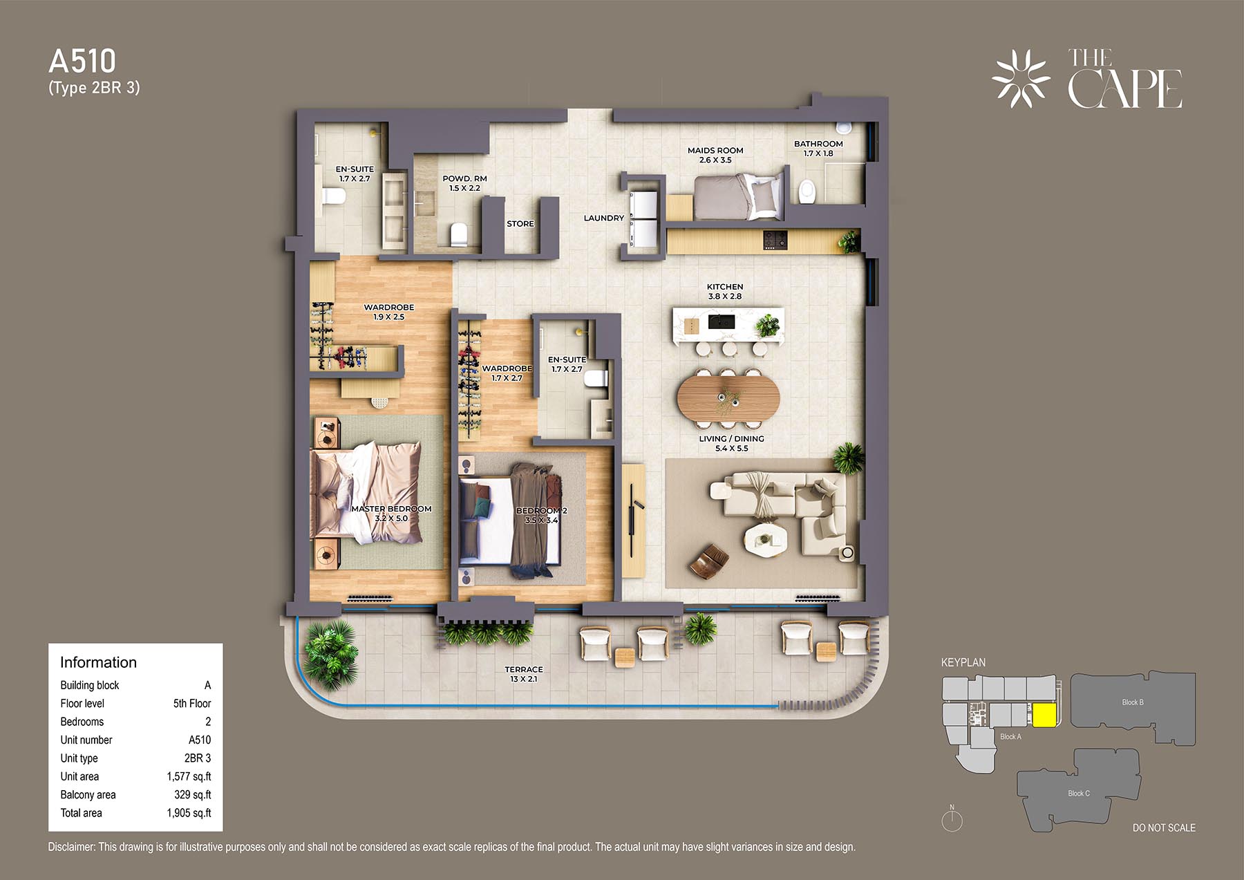 | Block A | 2 Bedrooms + Maid | 3rd Floor Unit-A310 (Type 2BR 3) | 1905.00 Sq Ft | Click Here |