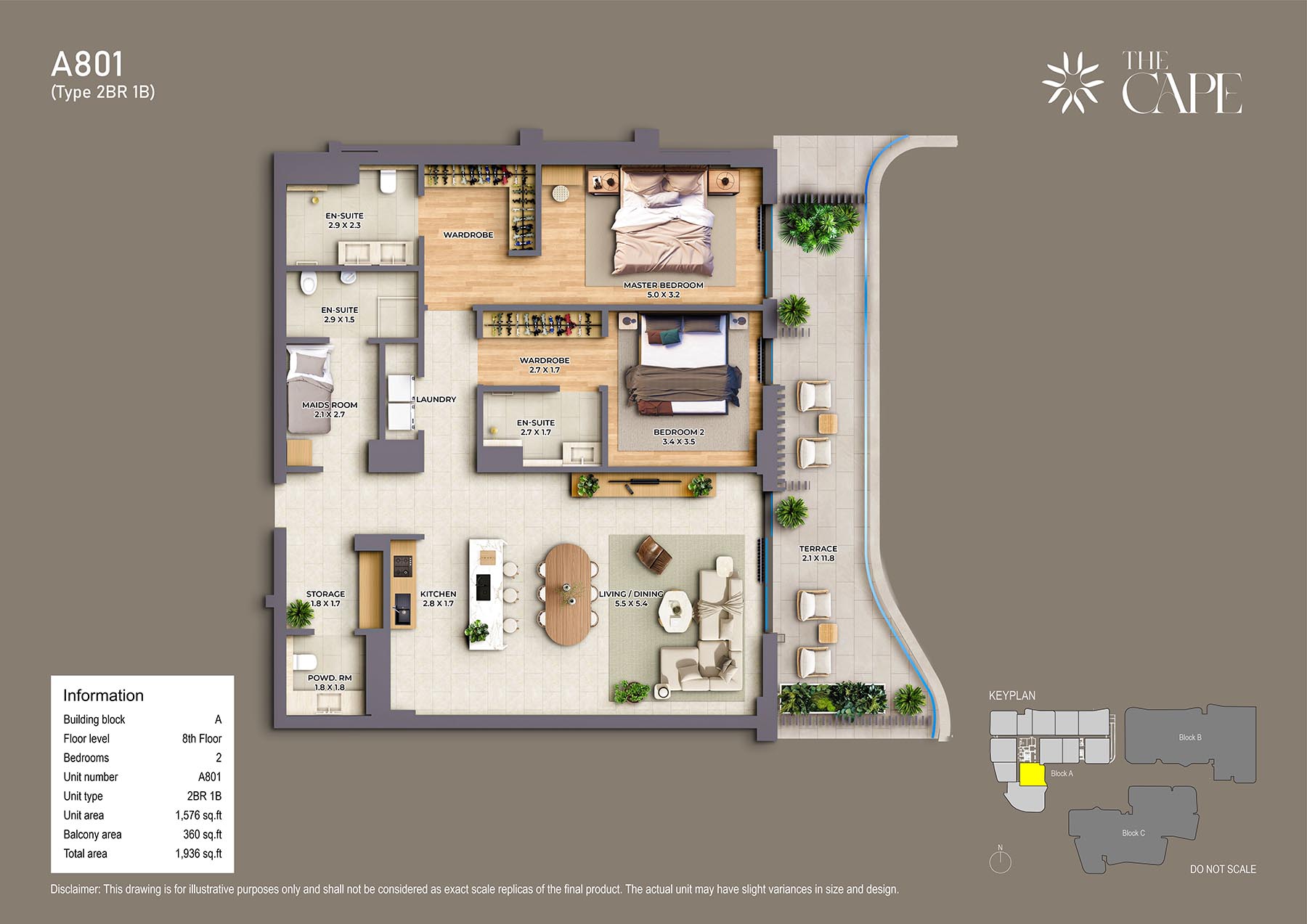| Block A | 2 Bedrooms + Maid | 8th Floor Unit-A801 (Type 2BR 1B) | 1936.00 Sq Ft | Click Here |