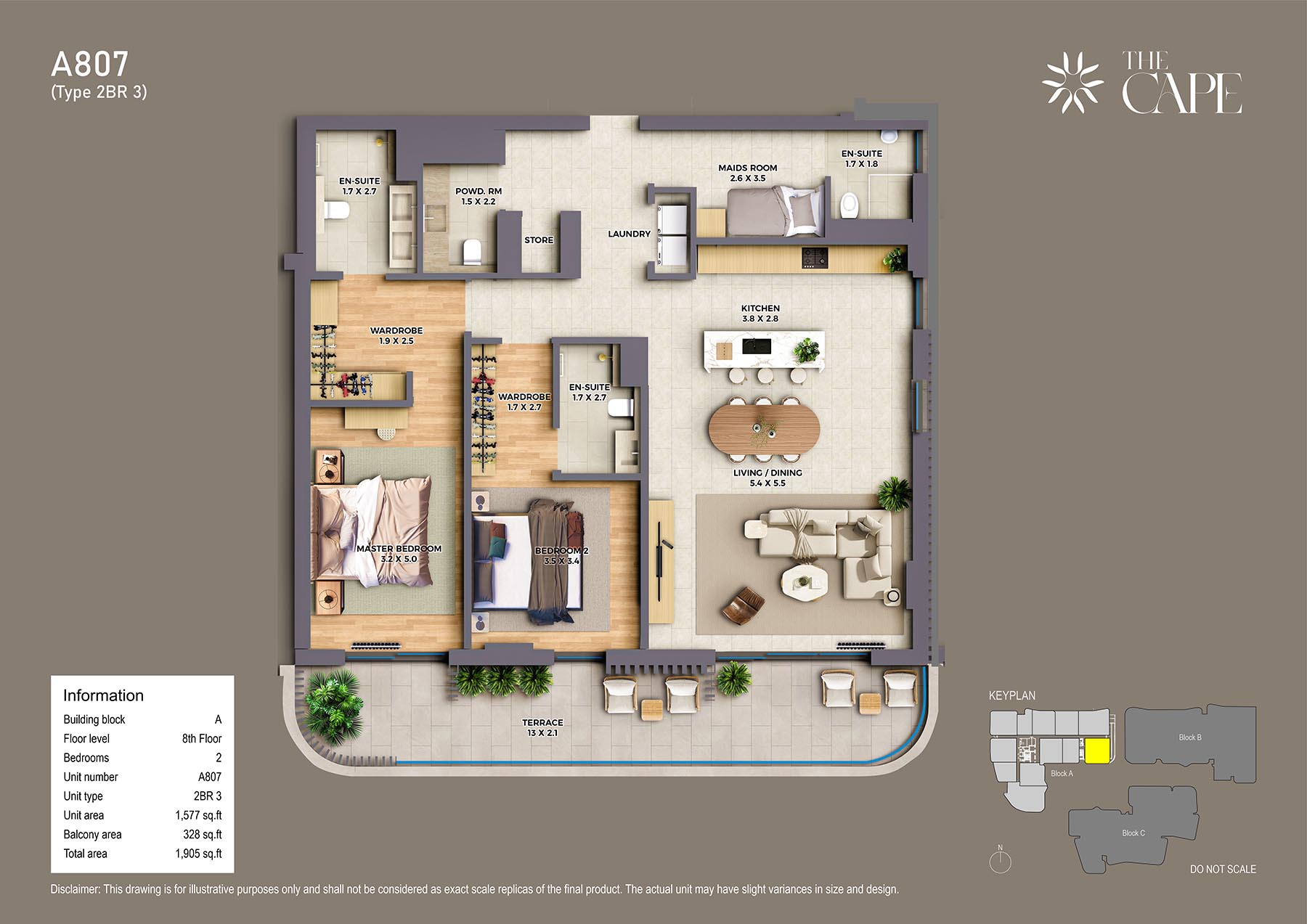 | Block A | 2 Bedrooms + Maid | 8th Floor Unit-A807 (Type 2BR 3) | 1905.00 Sq Ft | Click Here |
