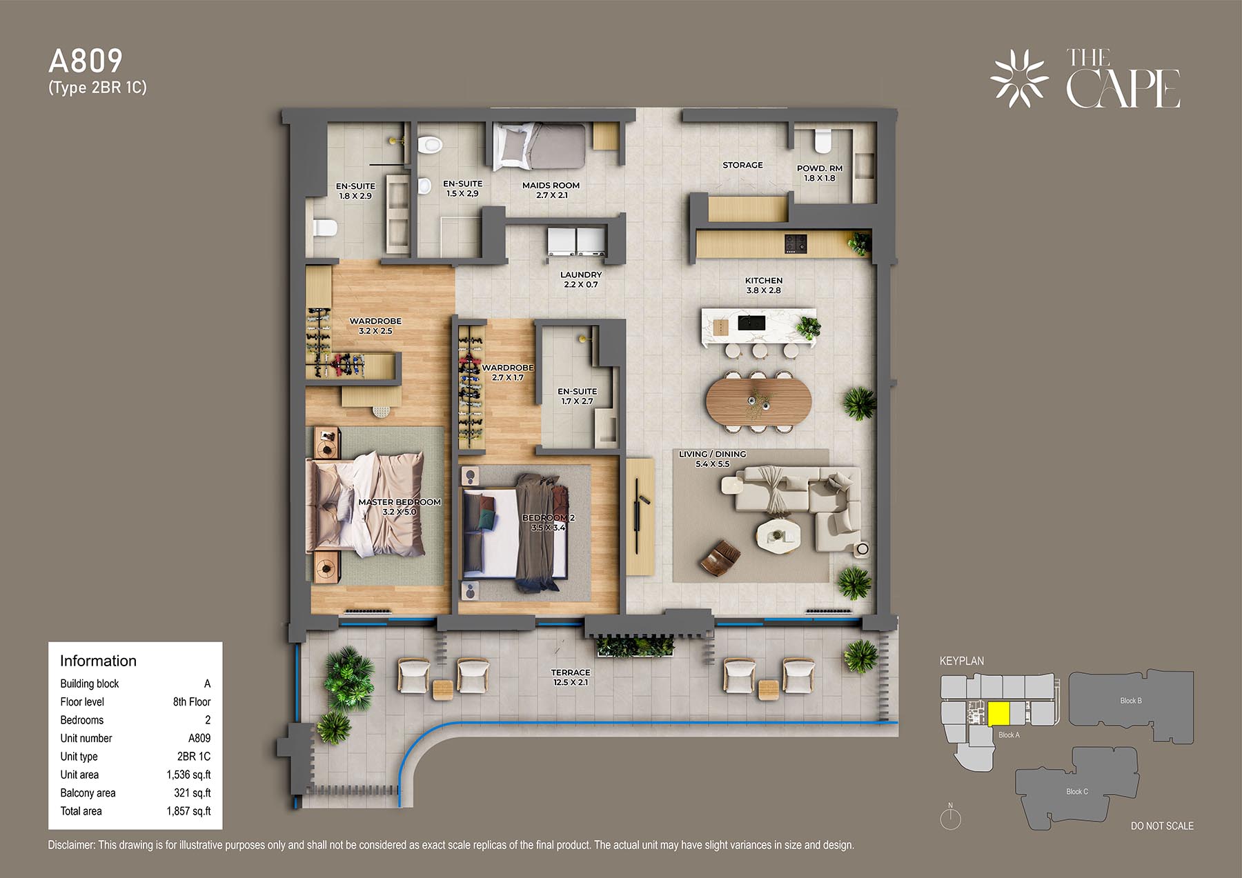 | Block A | 2 Bedrooms + Maid | 8th Floor Unit-A809 (Type 2BR 1C) | 1857.00 Sq Ft | Click Here |
