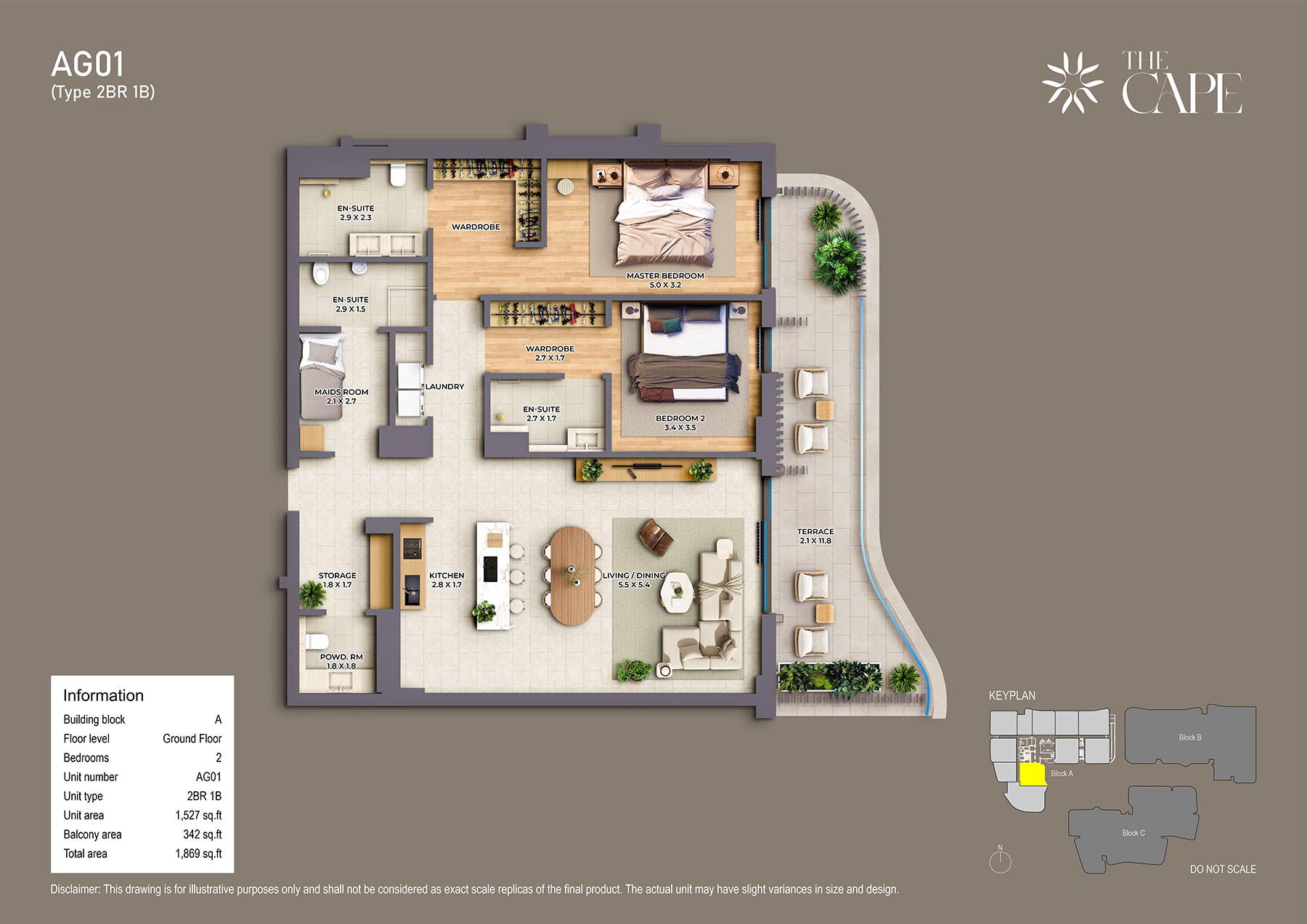 | Block A | 2 Bedrooms + Maid | Ground Floor Unit-AG01 (Type 2BR 1B) | 1869.00 Sq Ft | Click Here |