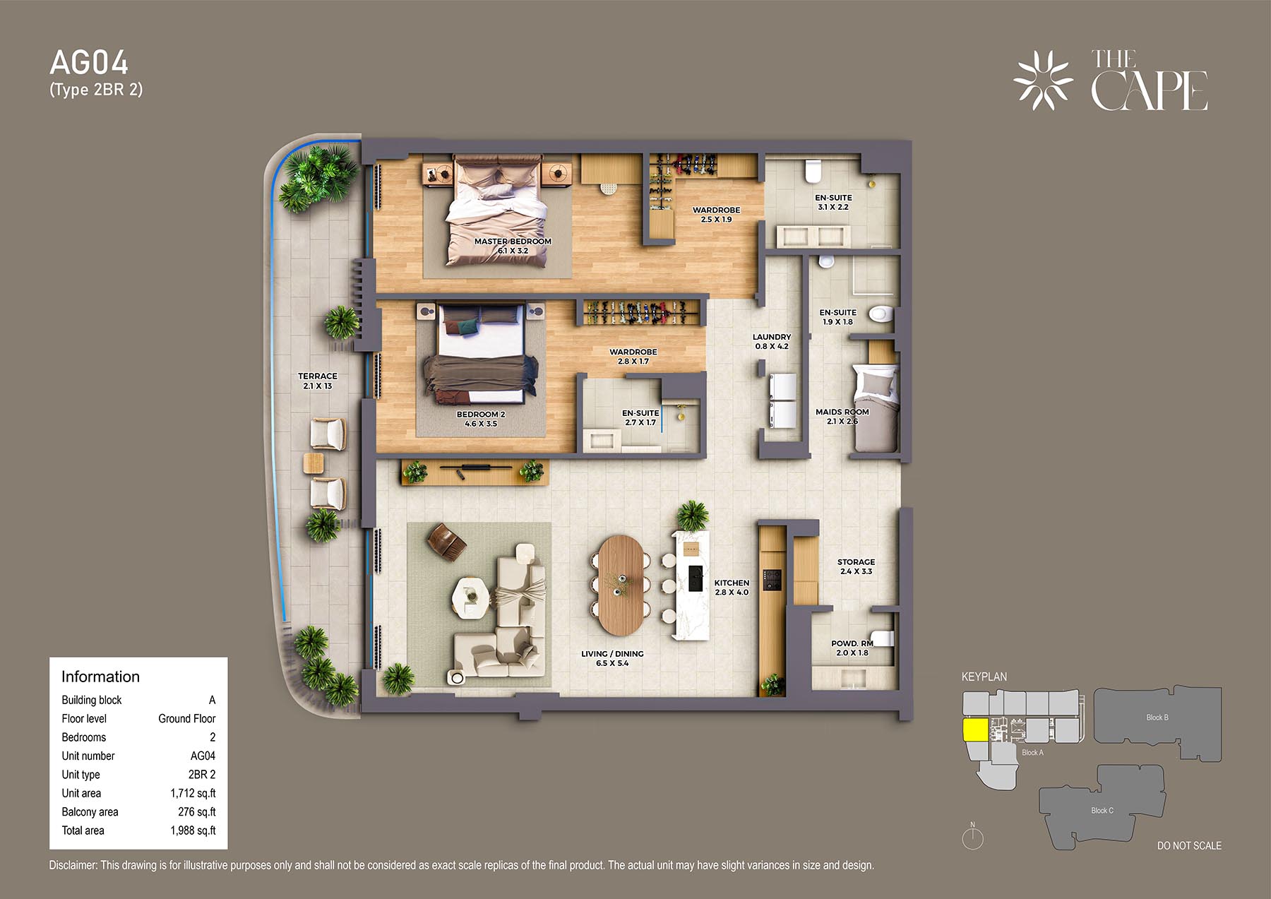 | Block A | 2 Bedrooms + Maid | Ground Floor Unit-AG04 (Type 2BR 2) | 1988.00 Sq Ft | Click Here |