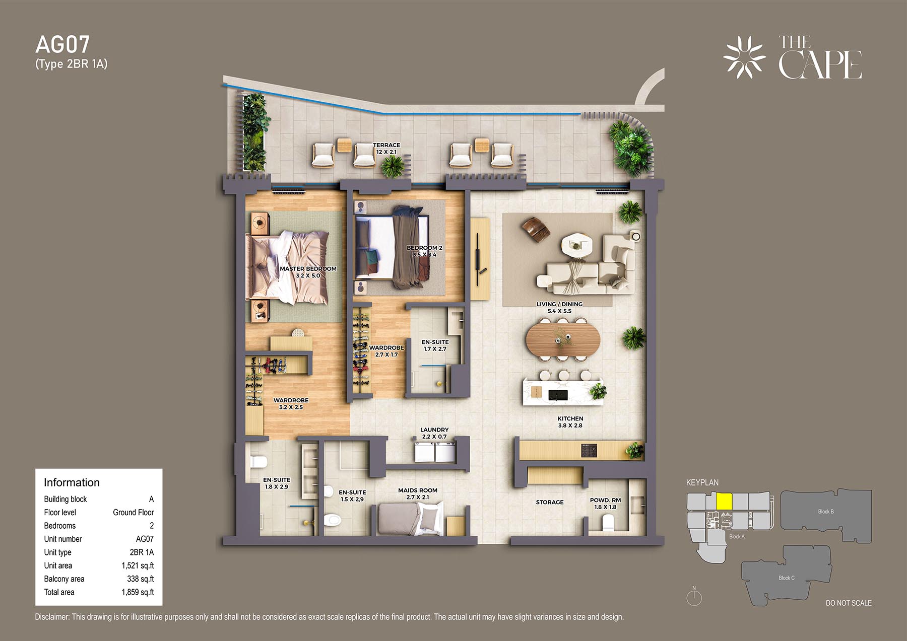 | Block A | 2 Bedrooms + Maid | Ground Floor Unit-AG07 (Type 2BR 1A) | 1859.00 Sq Ft | Click Here |