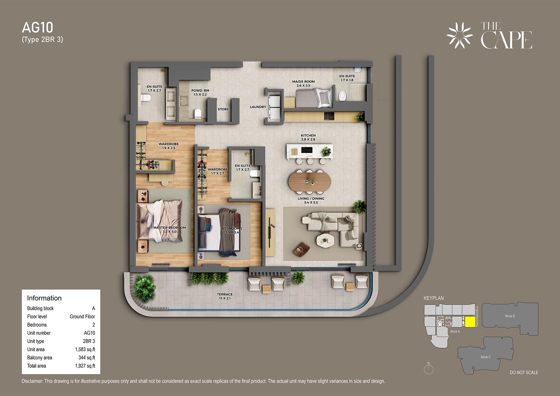 | Block A | 2 Bedrooms + Maid | Ground Floor Unit-AG10 (Type 2BR 3) | 1927.00 Sq Ft | Click Here |