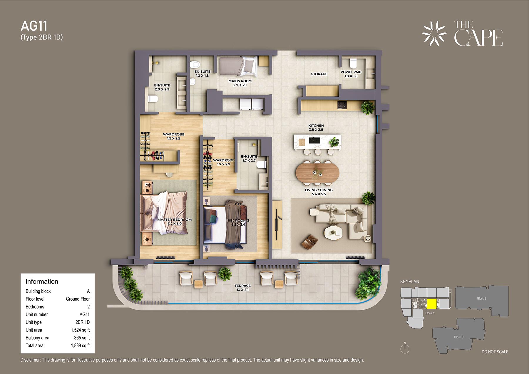 | Block A | 2 Bedrooms + Maid | Ground Floor Unit-AG11 (Type 2BR 1D) | 1889.00 Sq Ft | Click Here |