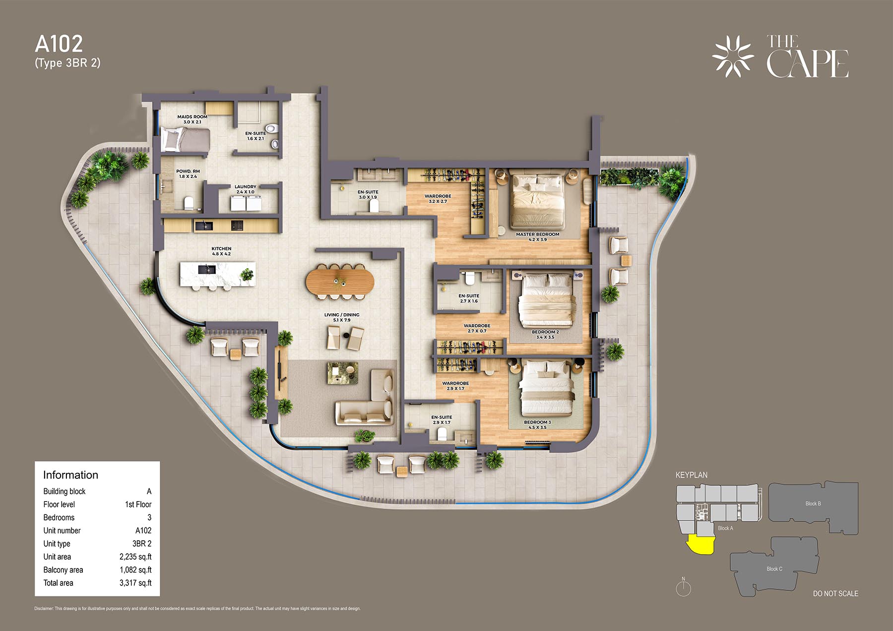 | Block A | 3 Bedrooms + Maid | 1st Floor Unit-A102 (Type 3BR 2) | 3317.00 Sq Ft | Click Here |