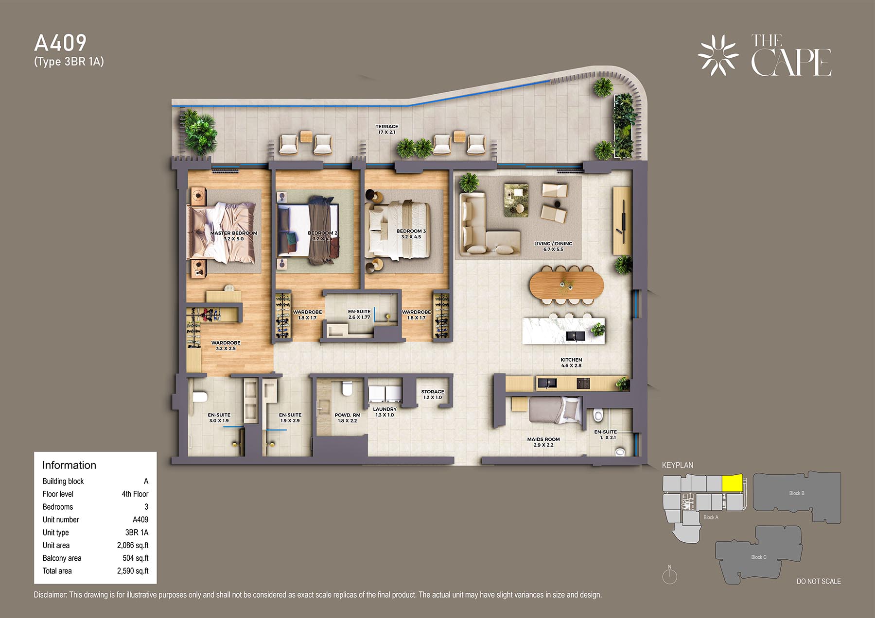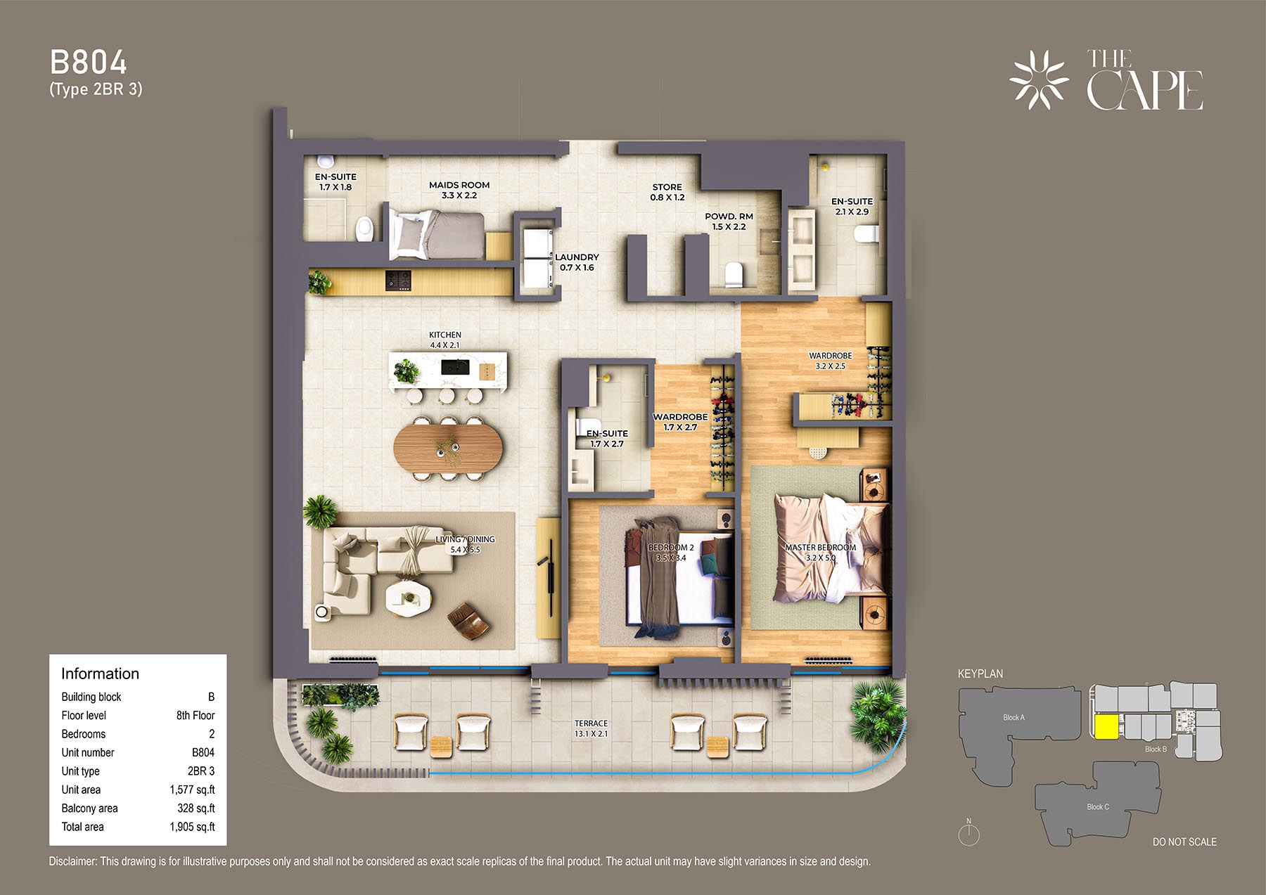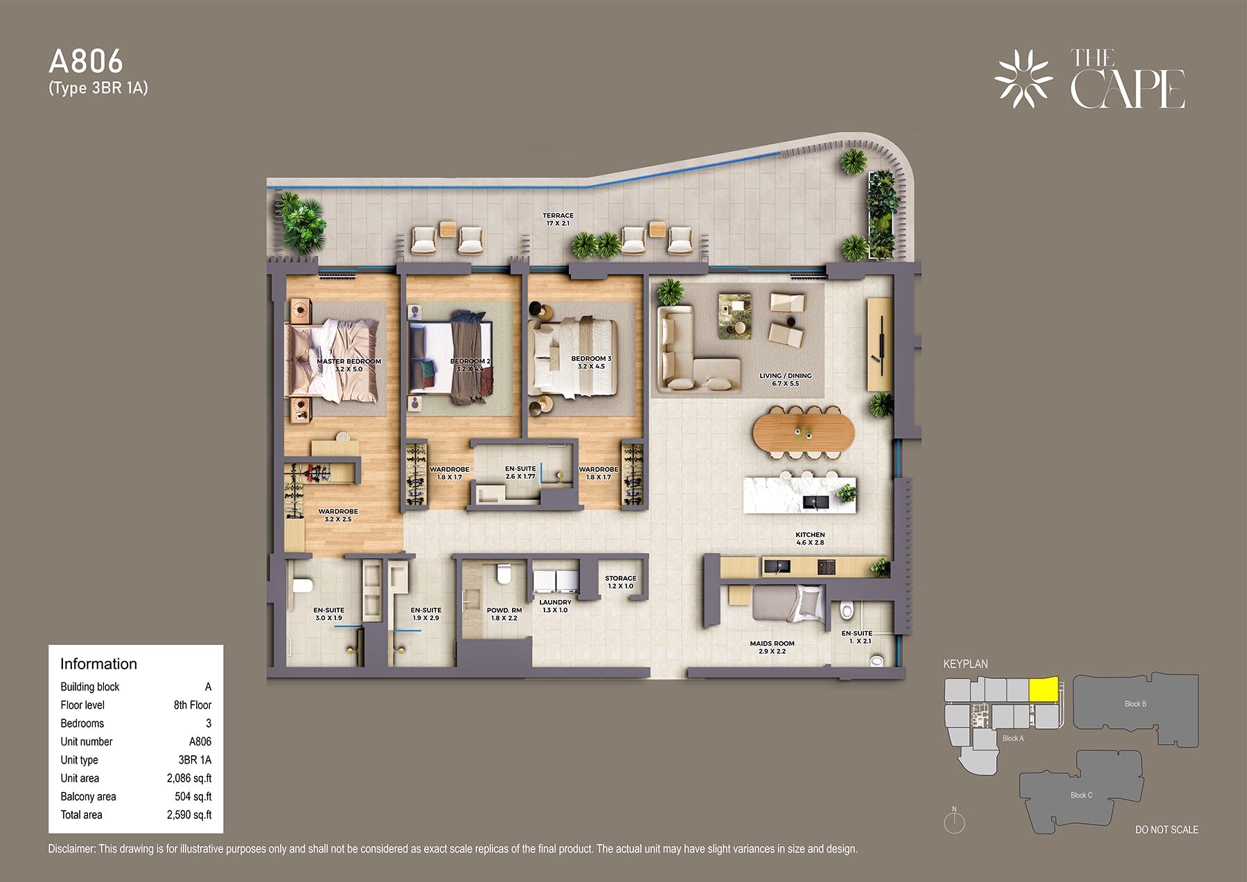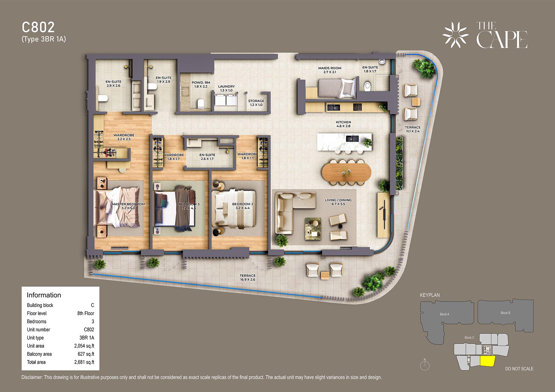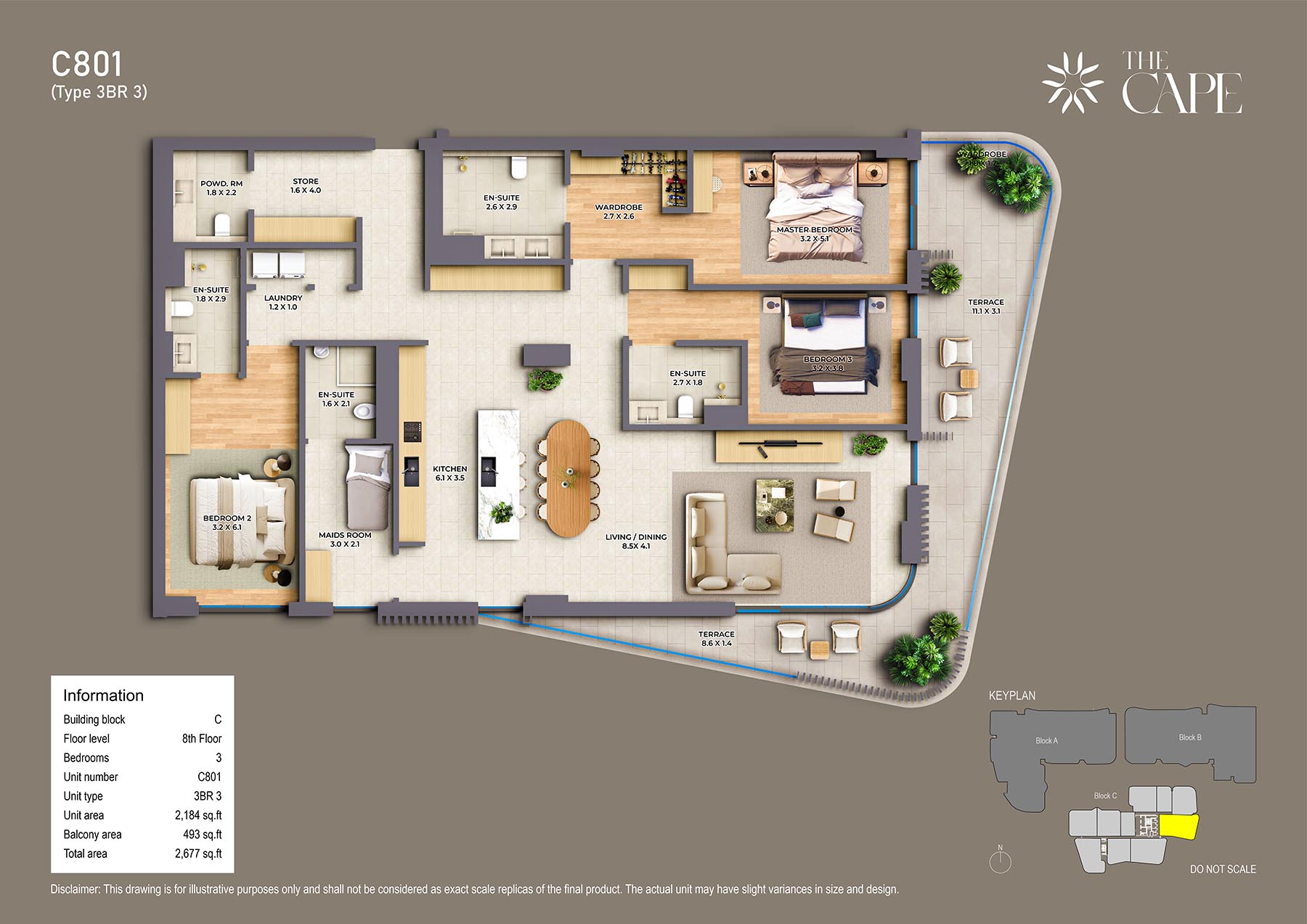 | Block C | 3 Bedrooms + Maid | 8th Floor Unit-C801 (Type 3BR 3) | 2677.00 Sq Ft | Click Here |