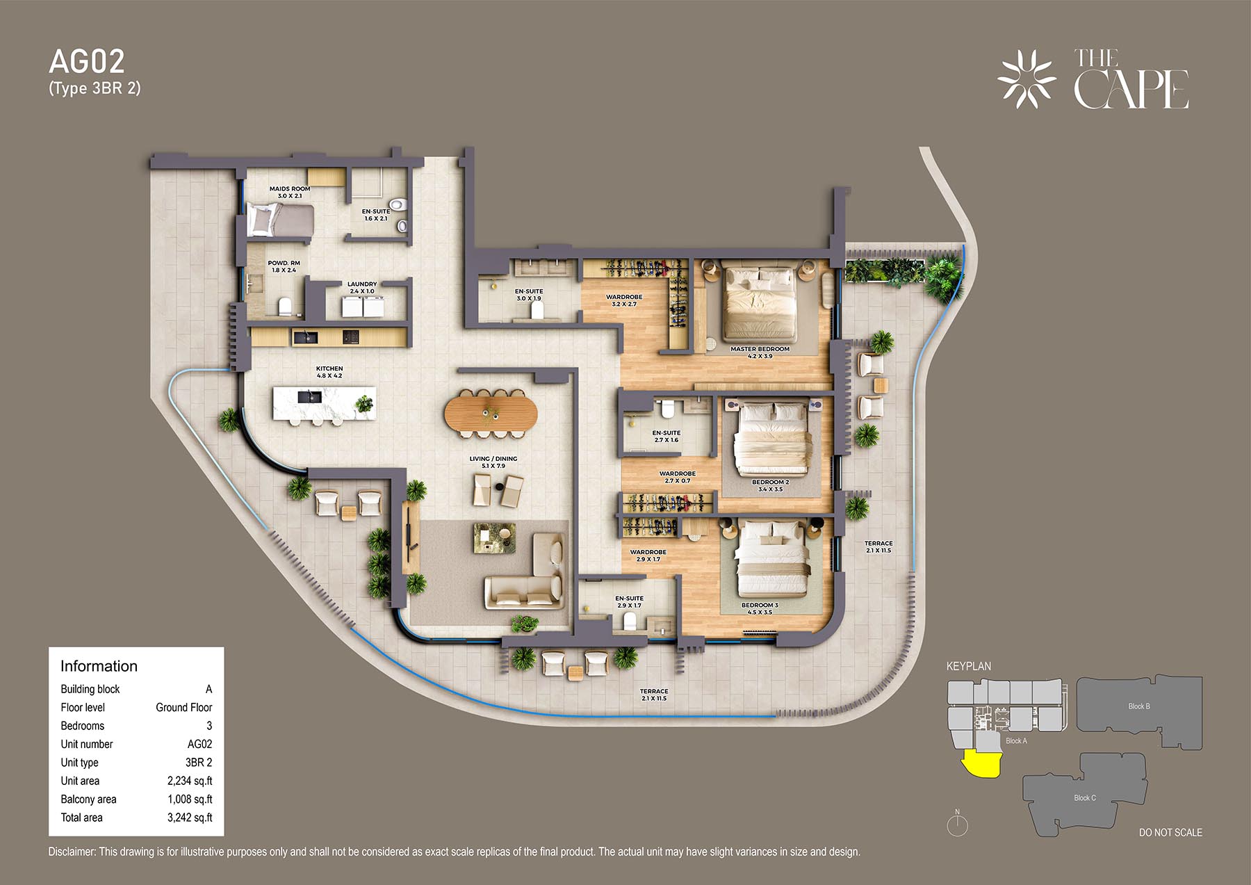 | Block A | 3 Bedrooms + Maid | Ground Floor Unit-AG02 (Type 3BR 2) | 3242.00 Sq Ft | Click Here |