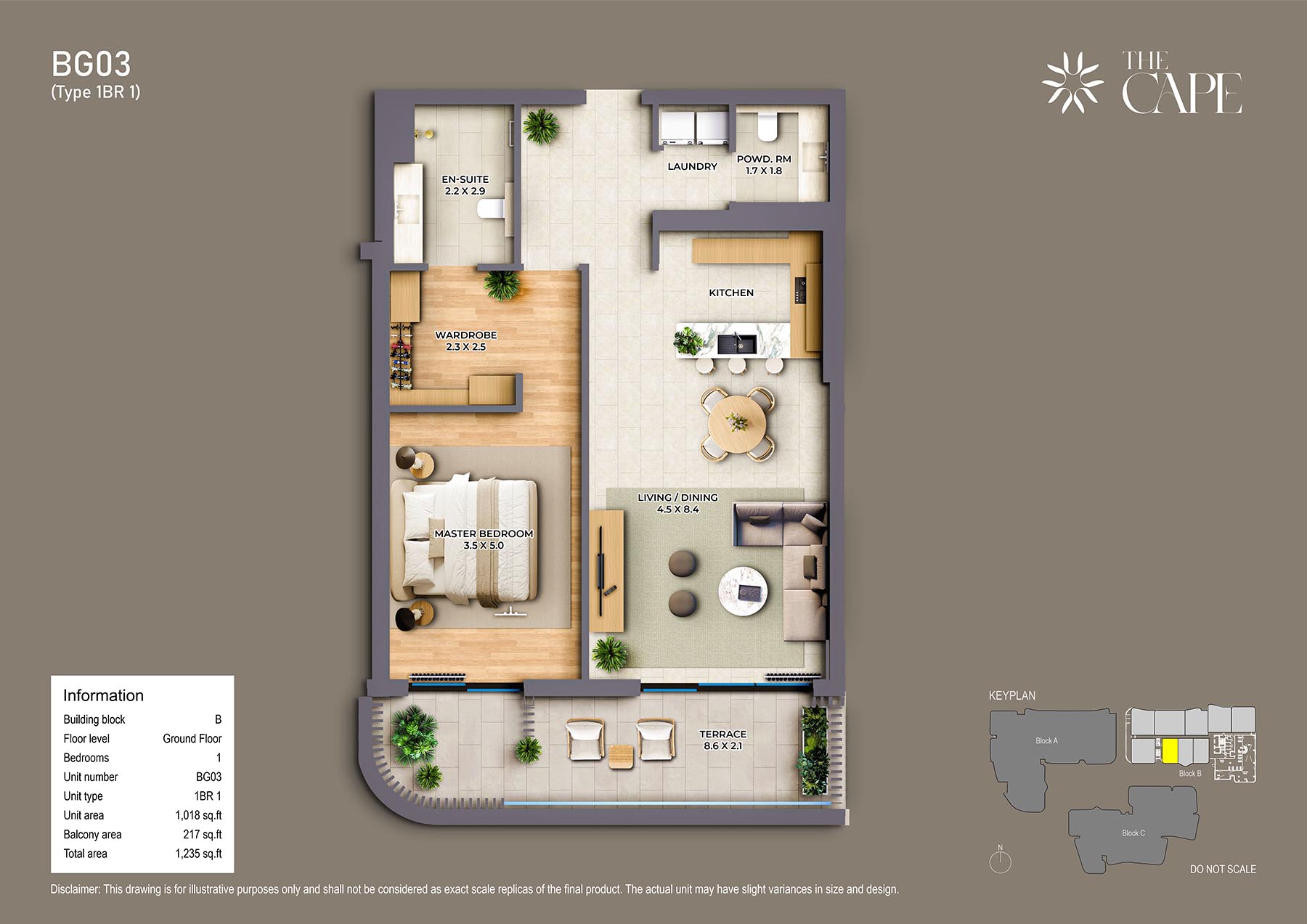| Block B | 1 Bedroom | Ground Floor Unit-BG03 (Type 1BR 1) | 1235.00 Sq Ft | Click Here |
