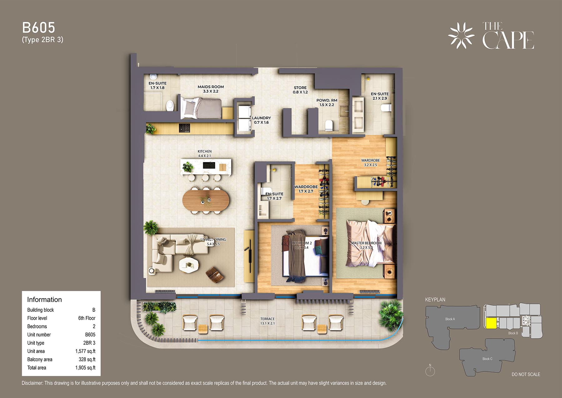 | Block B | 2 Bedrooms + Maid | 6th Floor Unit-B605 (Type 2BR 3) | 1905.00 Sq Ft | Click Here |