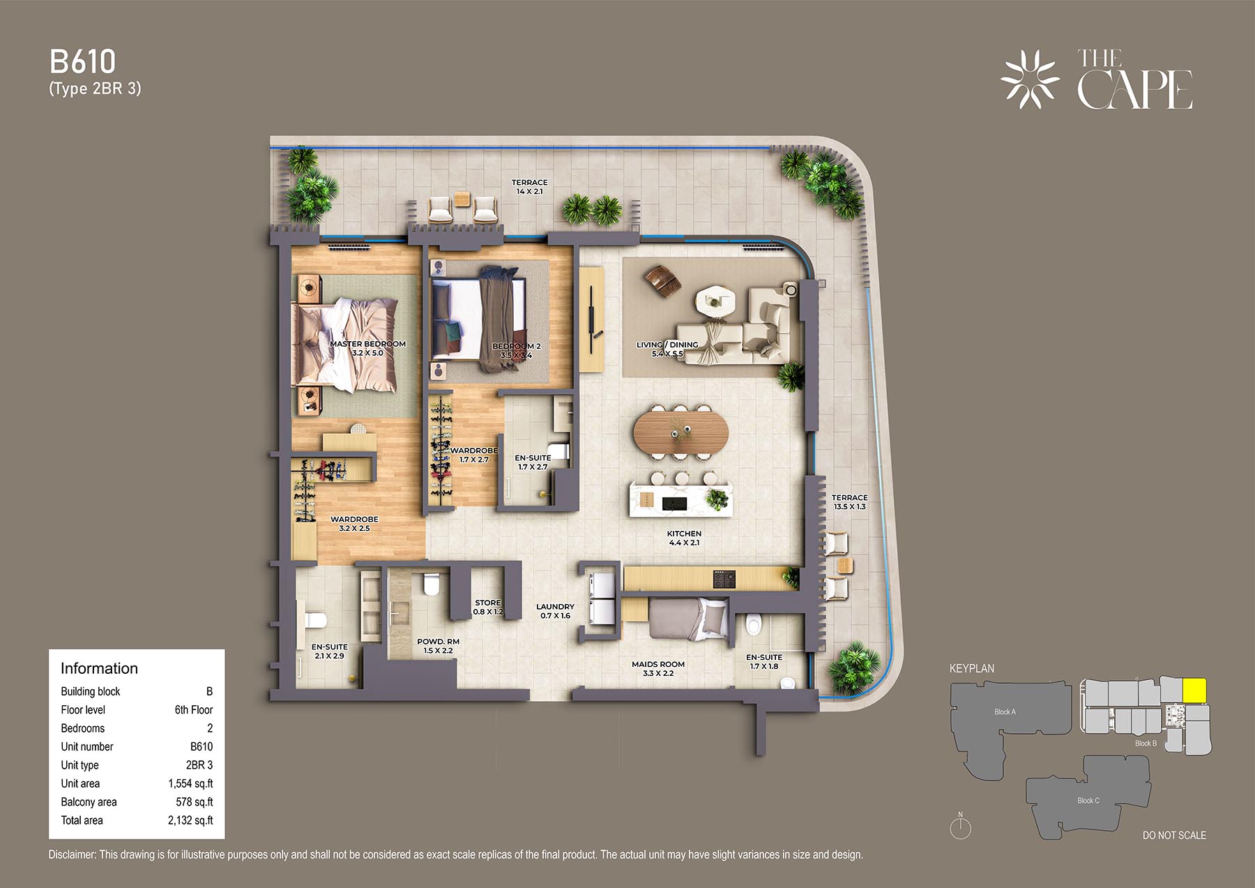 | Block B | 2 Bedrooms + Maid | 6th Floor Unit-B610 (Type 2BR 3) | 2132.00 Sq Ft | Click Here |