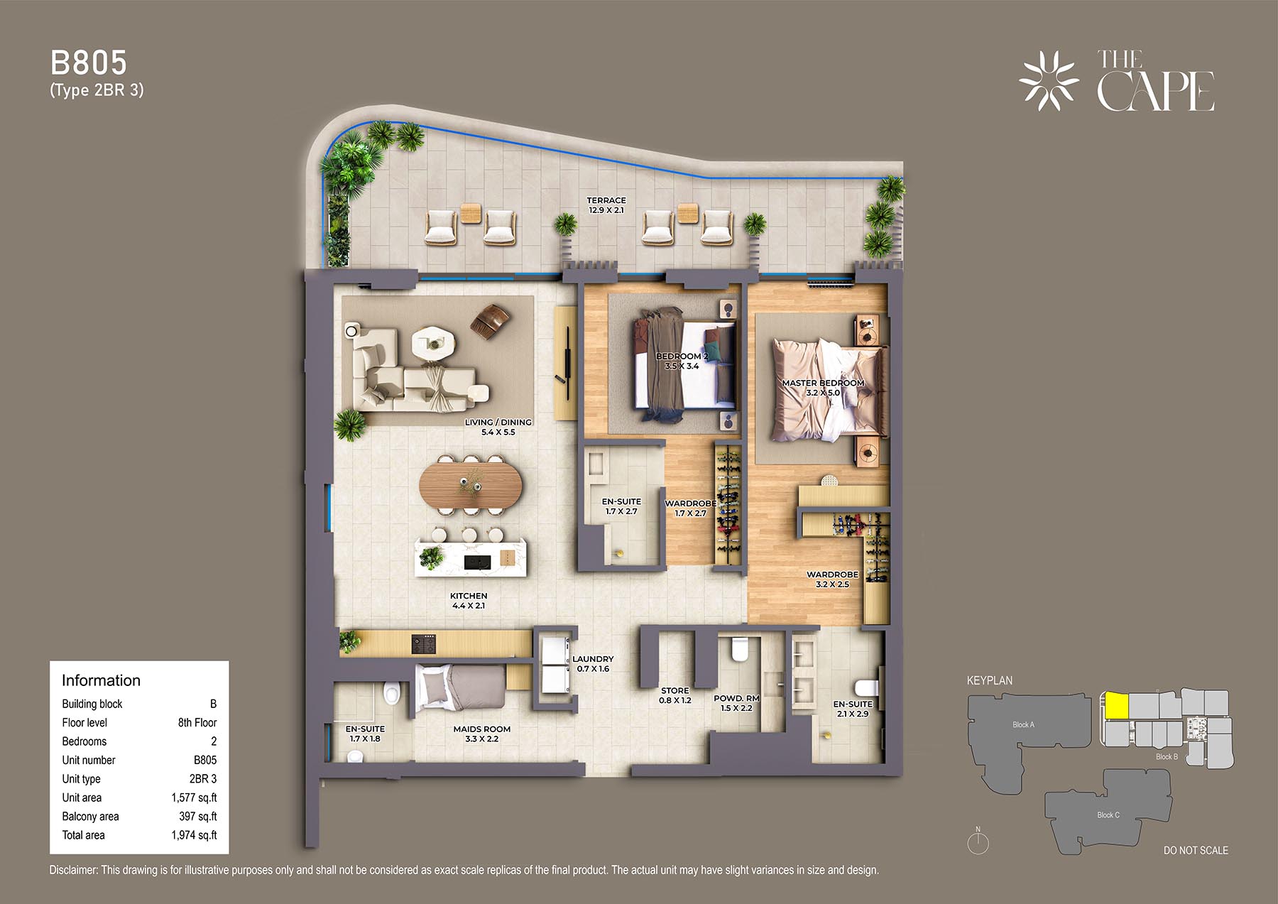 | Block B | 2 Bedrooms + Maid | 8th Floor Unit-B805 (Type 2BR 3) | 1974.00 Sq Ft | Click Here |