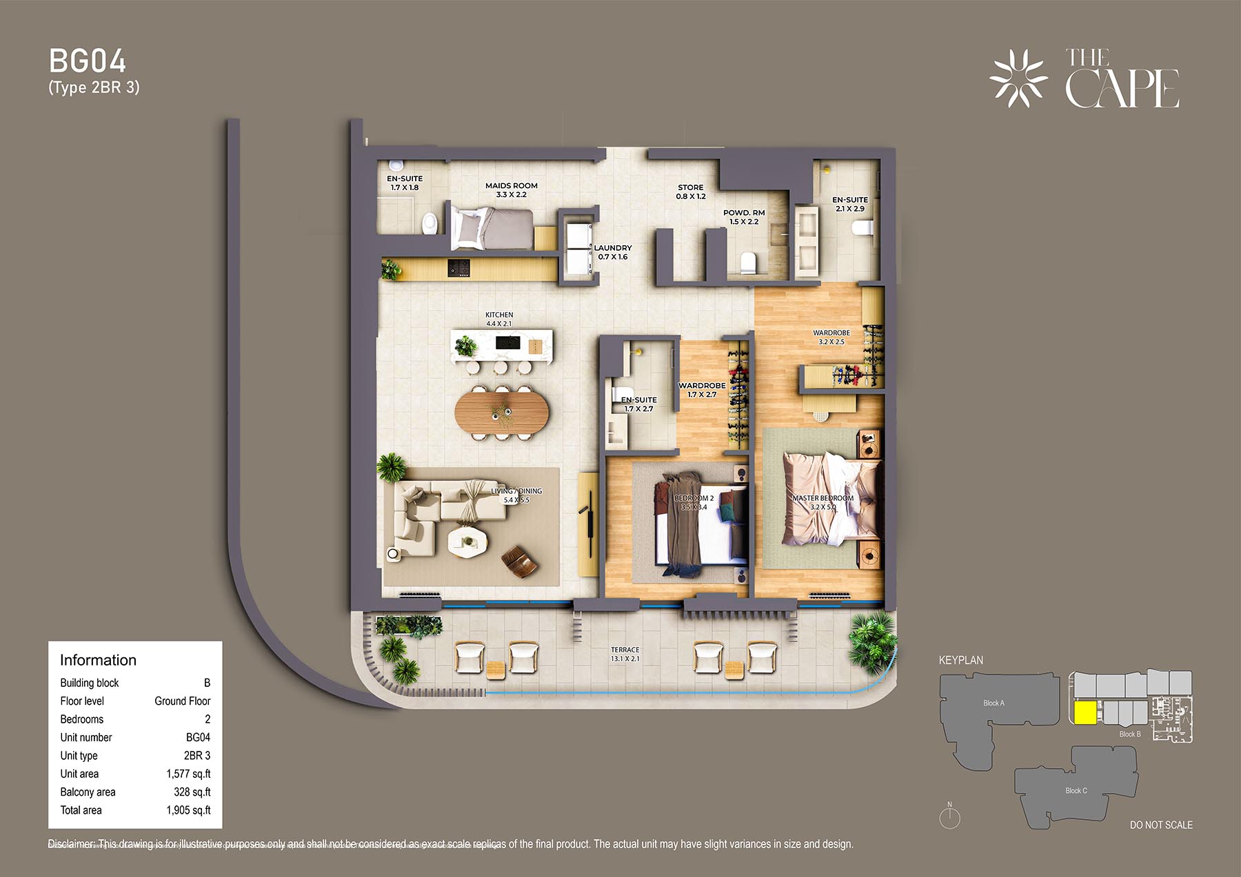 | Block B | 2 Bedrooms + Maid | Ground Floor Unit-BG04 (Type 2BR 3) | 1905.00 Sq Ft | Click Here |
