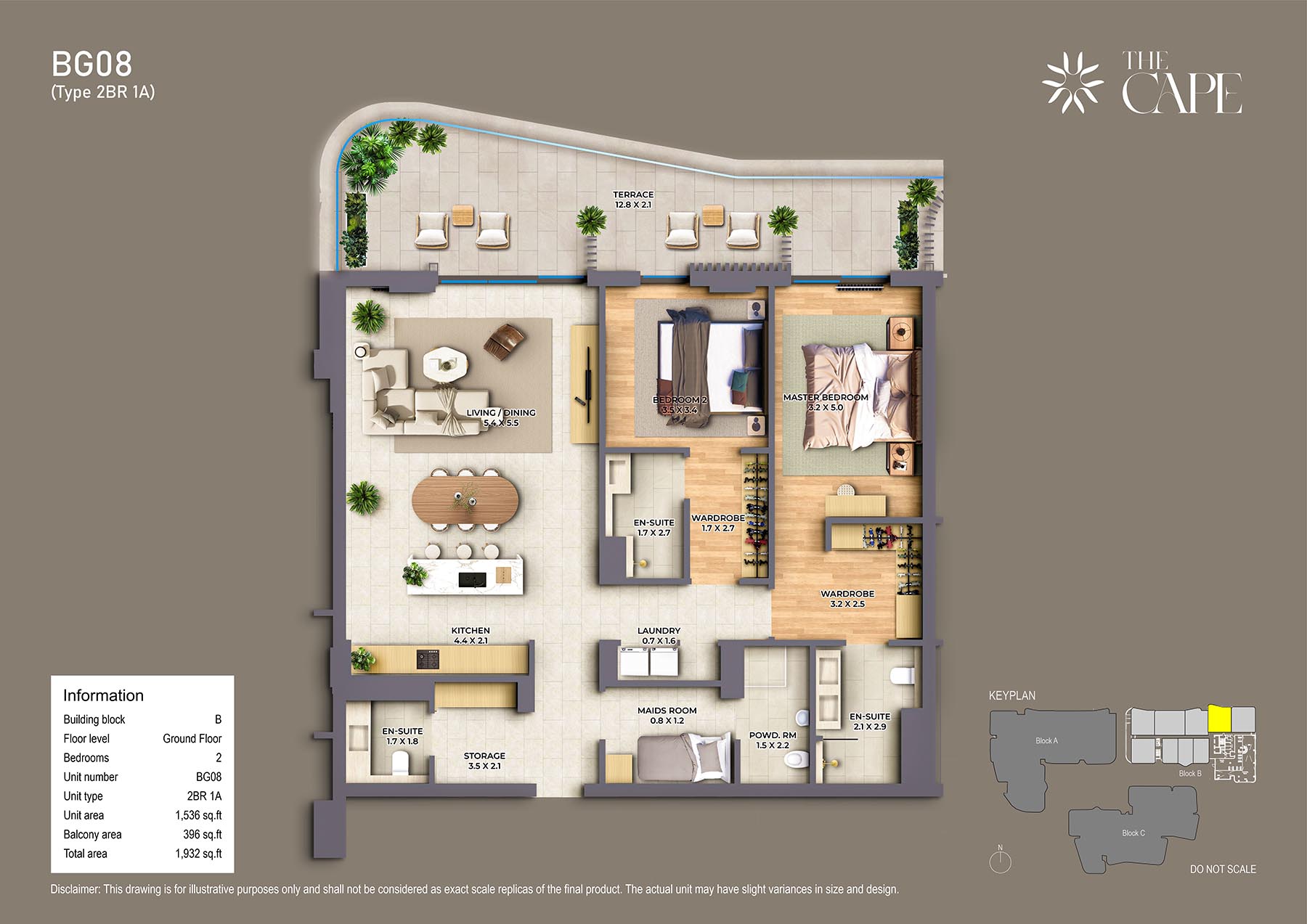 | Block B | 2 Bedrooms + Maid | Ground Floor Unit-BG08 (Type 2BR 1A) | 1932.00 Sq Ft | Click Here |