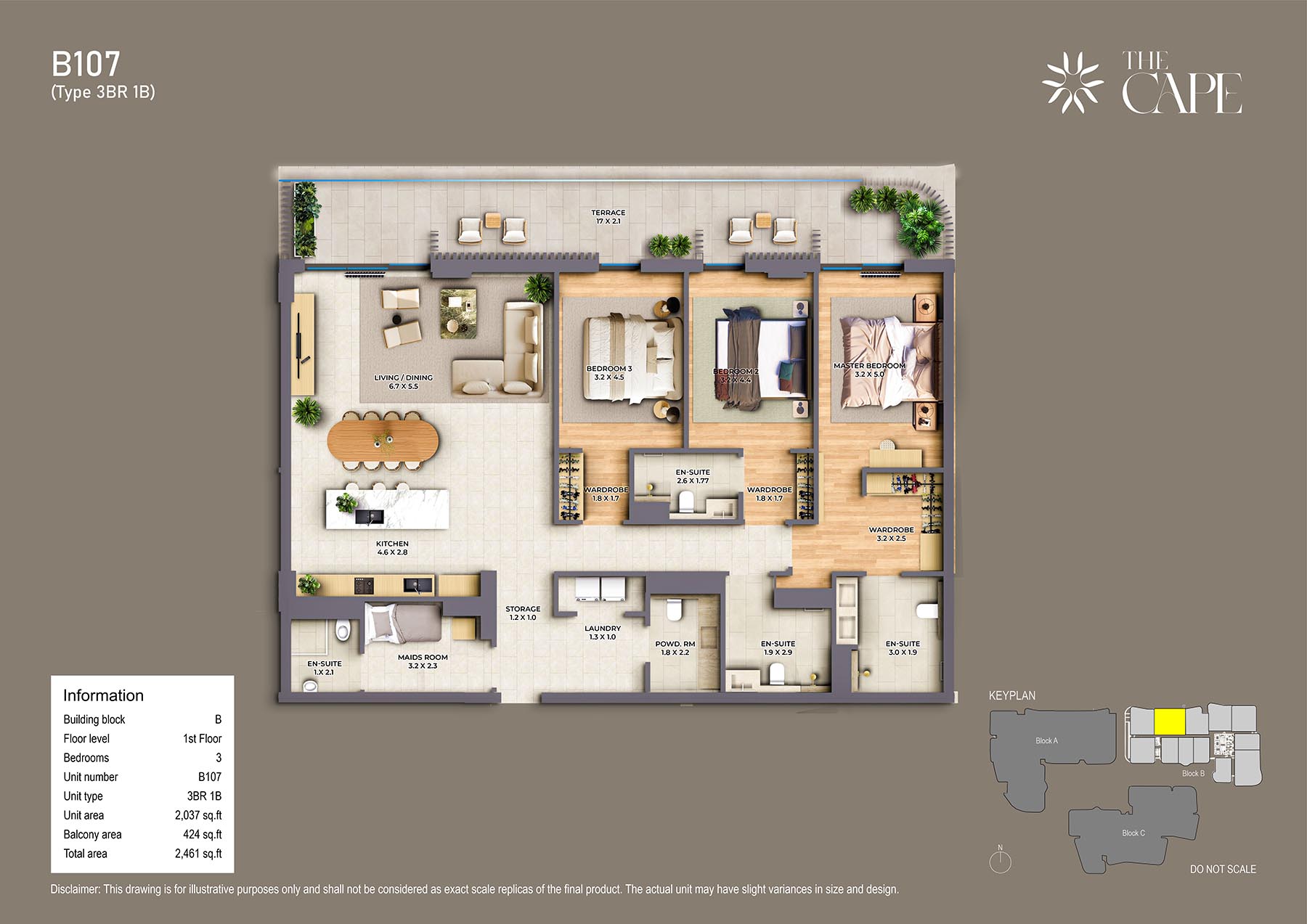 | Block B | 3 Bedrooms + Maid | 1st Floor Unit-B107 (Type 3BR 1B) | 2461.00 Sq Ft | Click Here |