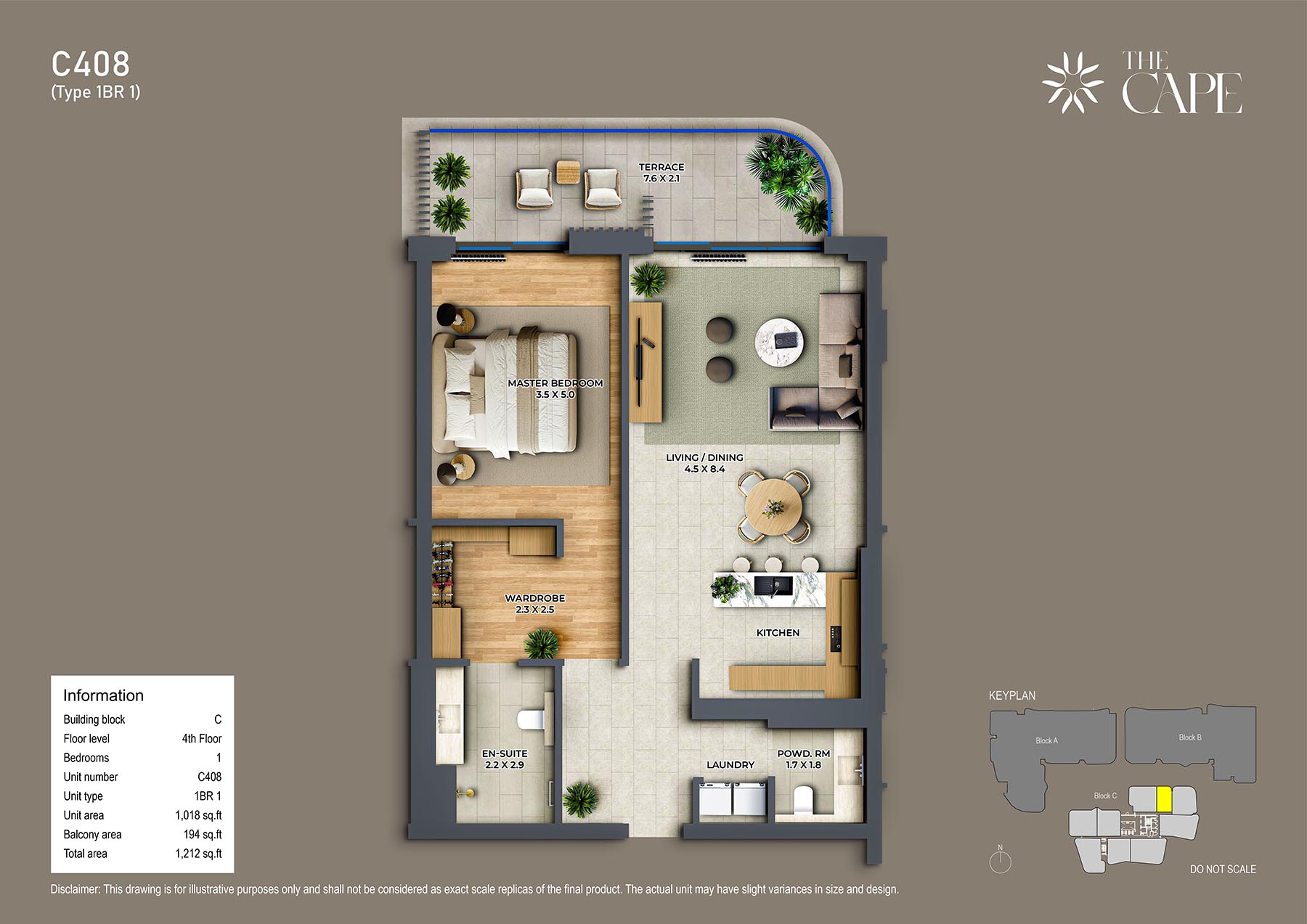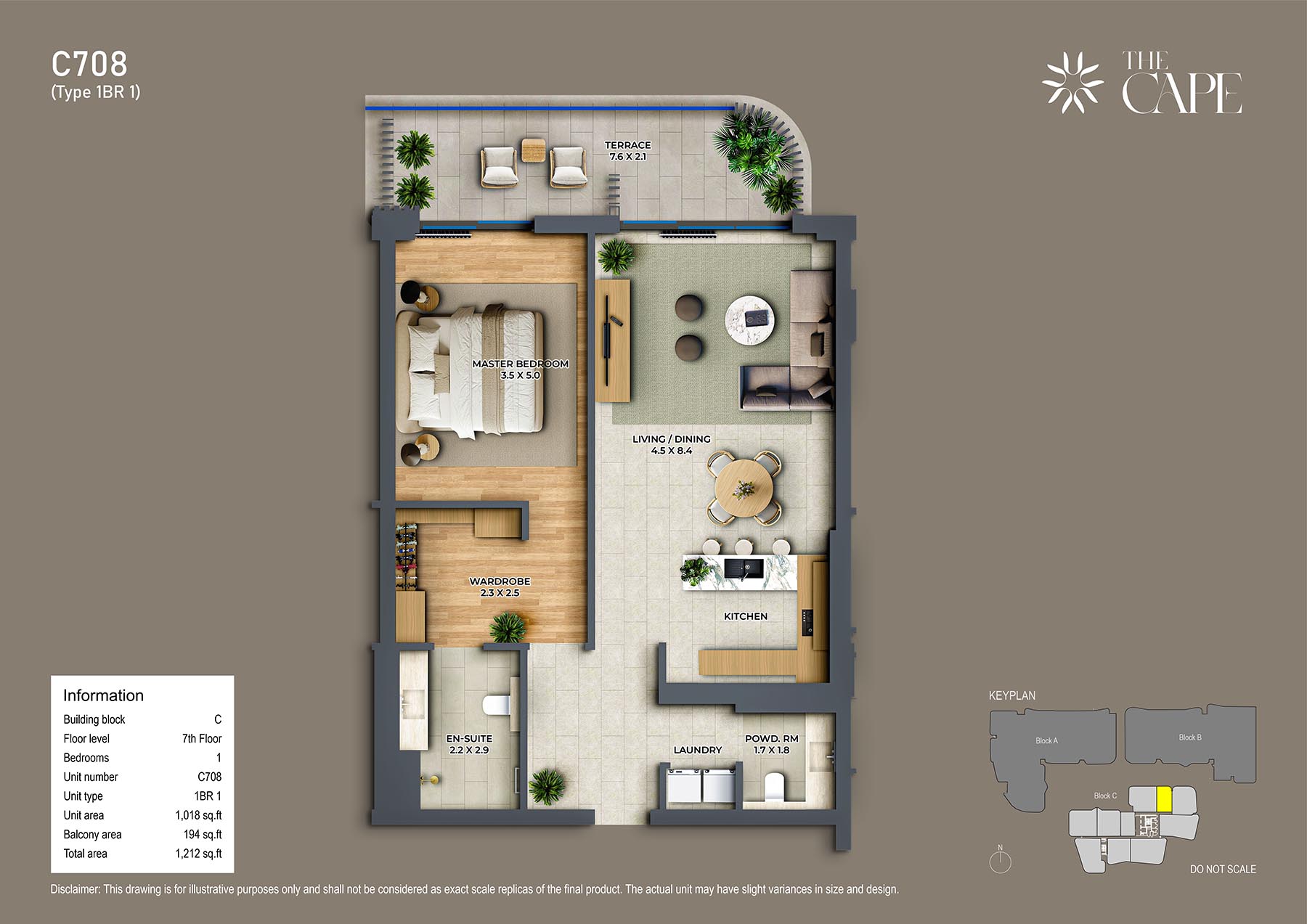 | Block C | 1 Bedroom | 7th Floor Unit-C708 (Type 1BR 1) | 1212.00 Sq Ft | Click Here |