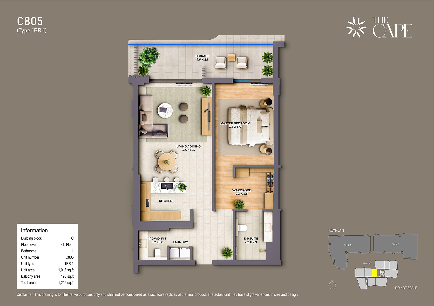 | Block C | 1 Bedroom | 8th Floor Unit-C805 (Type 1BR 1) | 1216.00 Sq Ft | Click Here |