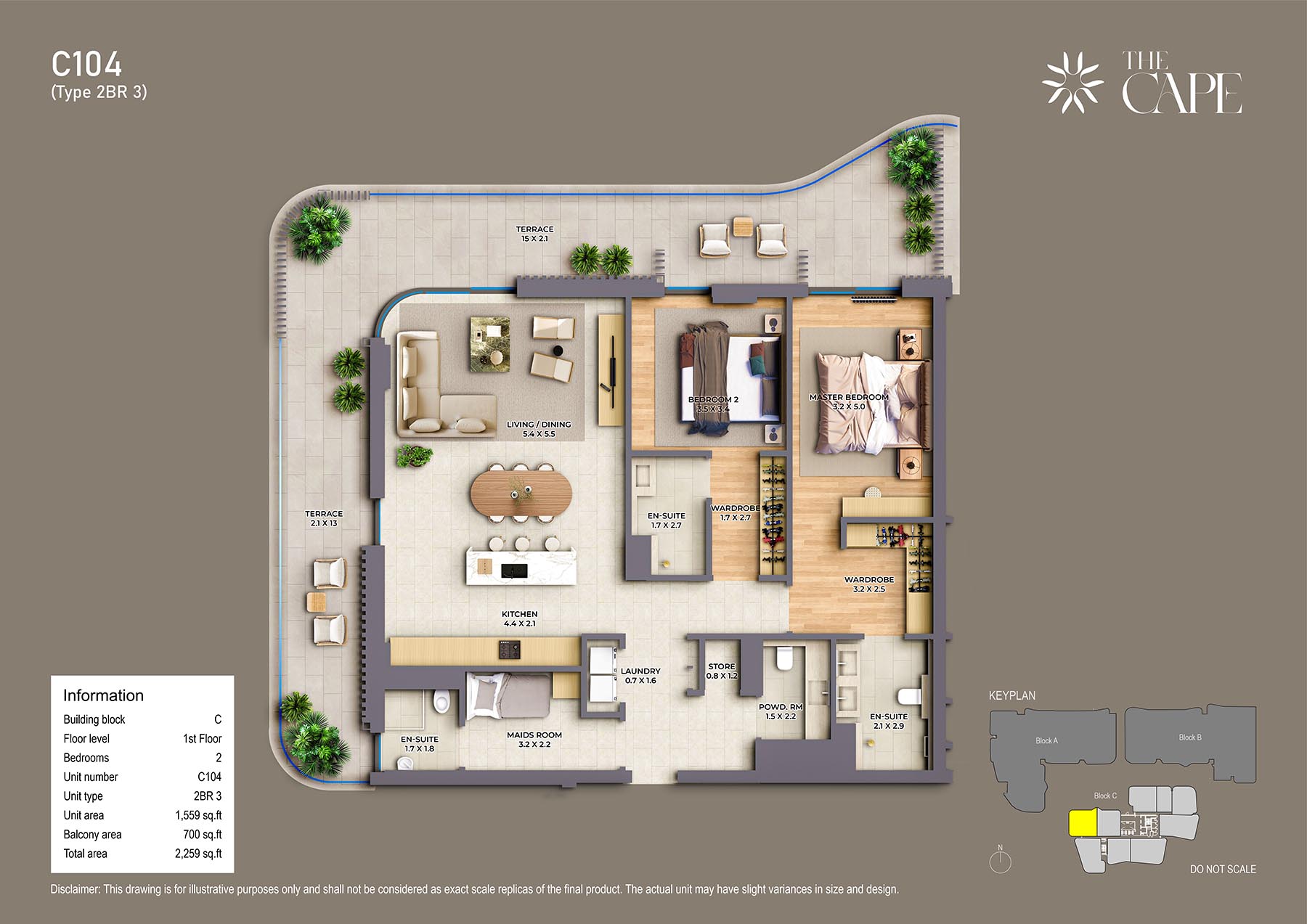 | Block C | 2 Bedrooms + Maid | 1st Floor Unit-C104 (Type 2BR 3) | 2259.00 Sq Ft | Click Here |