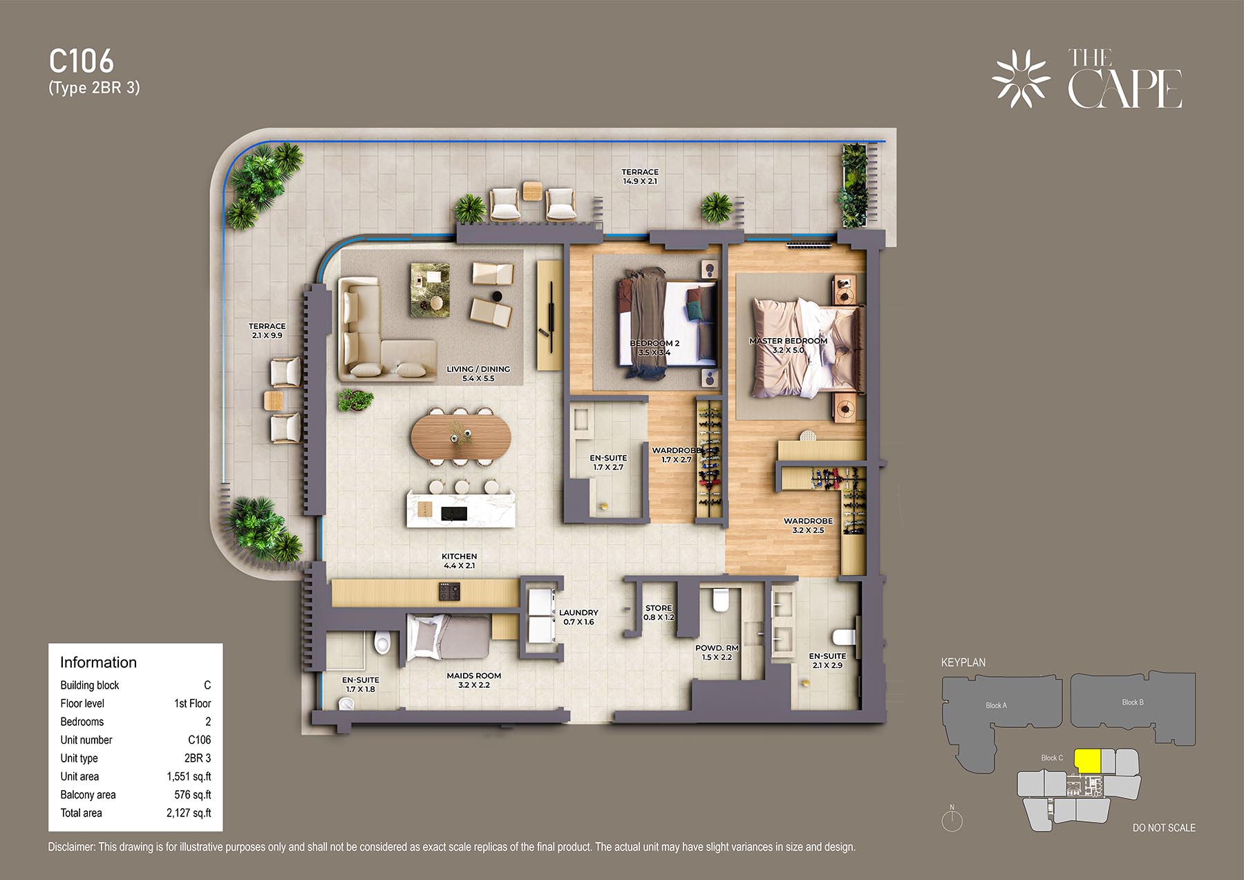 | Block C | 2 Bedrooms + Maid | 1st Floor Unit-C106 (Type 2BR 3) | 2127.00 Sq Ft | Click Here |