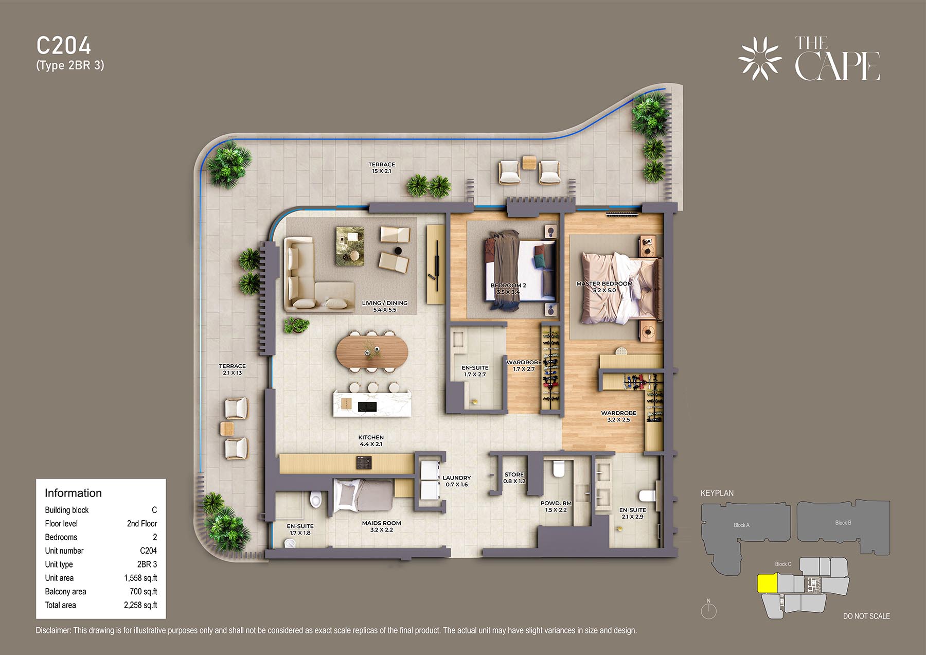 | Block C | 2 Bedrooms + Maid | 2nd Floor Unit-C204 (Type 2BR 3) | 2258.00 Sq Ft | Click Here |