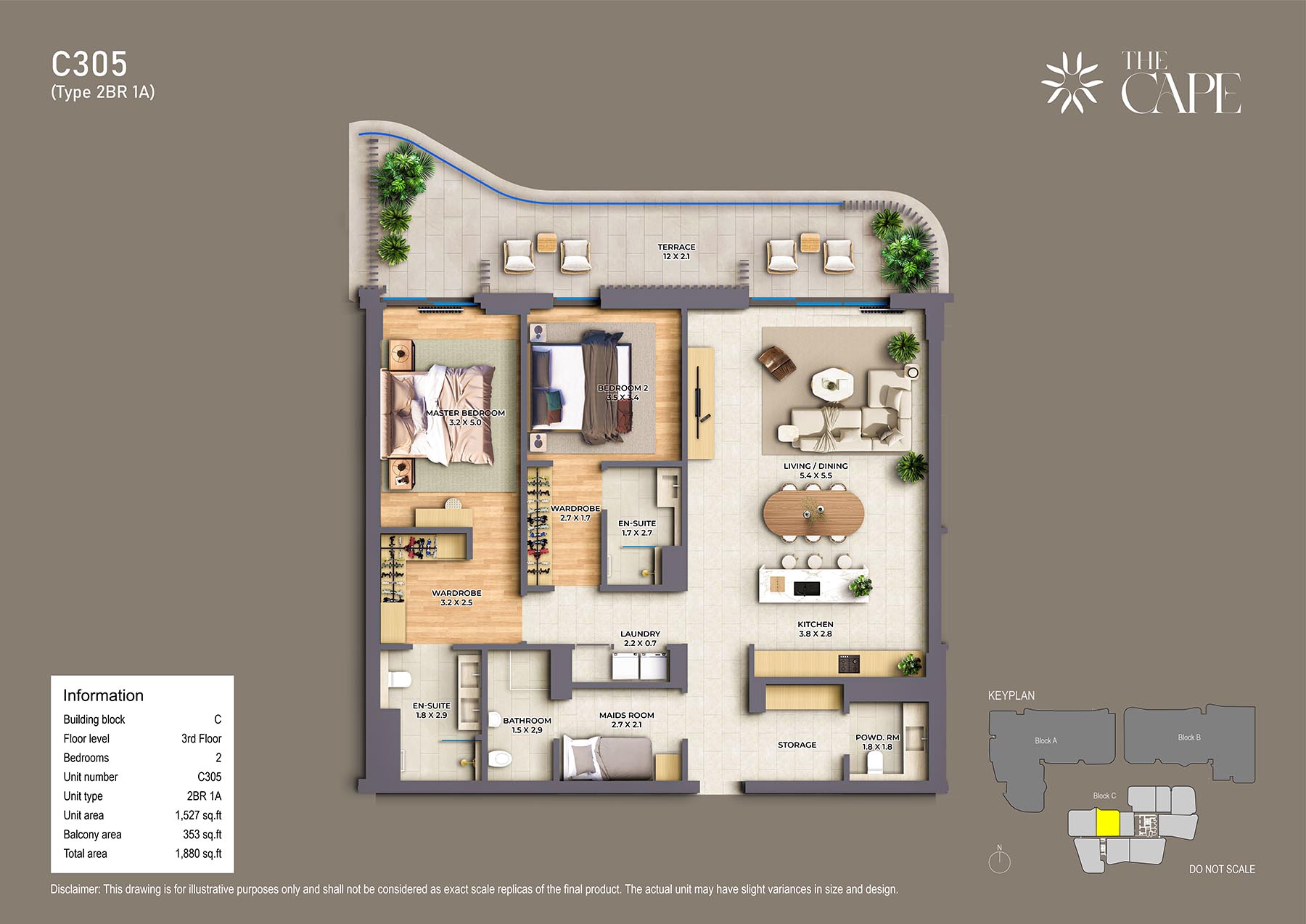 | Block C | 2 Bedrooms + Maid | 3rd Floor Unit-C305 (Type 2BR 1A) | 1880.00 Sq Ft | Click Here |