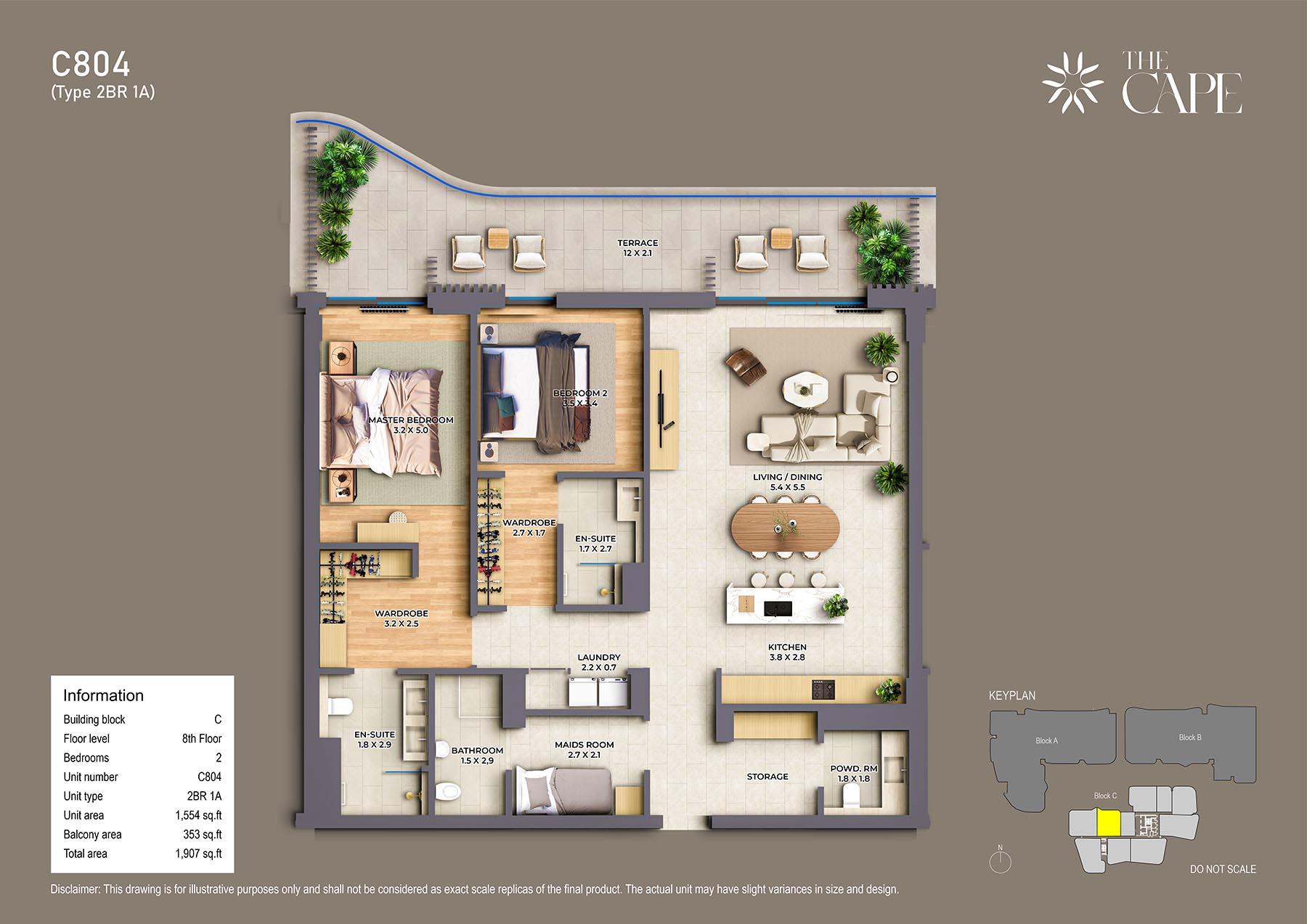 | Block C | 2 Bedrooms + Maid | 8th Floor Unit-C804 (Type 2BR 1A) | 1907.00 Sq Ft | Click Here |