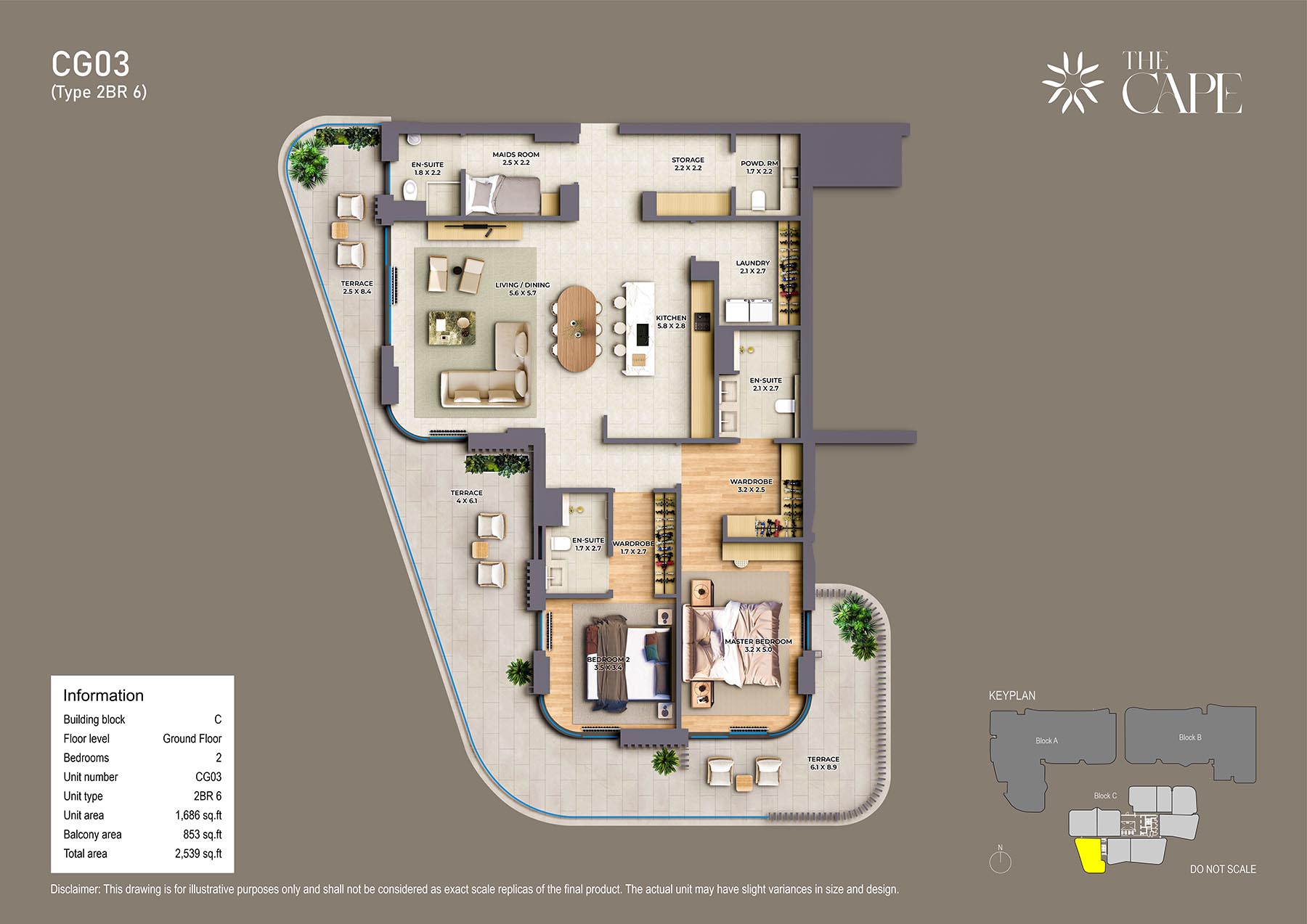 | Block C | 2 Bedrooms + Maid | Ground Floor Unit-CG03 (Type 2BR 6) | 2539.00 Sq Ft | Click Here |