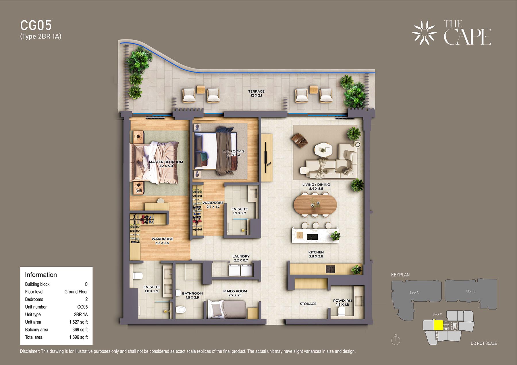 | Block C | 2 Bedrooms + Maid | Ground Floor Unit-CG05 (Type 2BR 1A) | 1896.00 Sq Ft | Click Here |