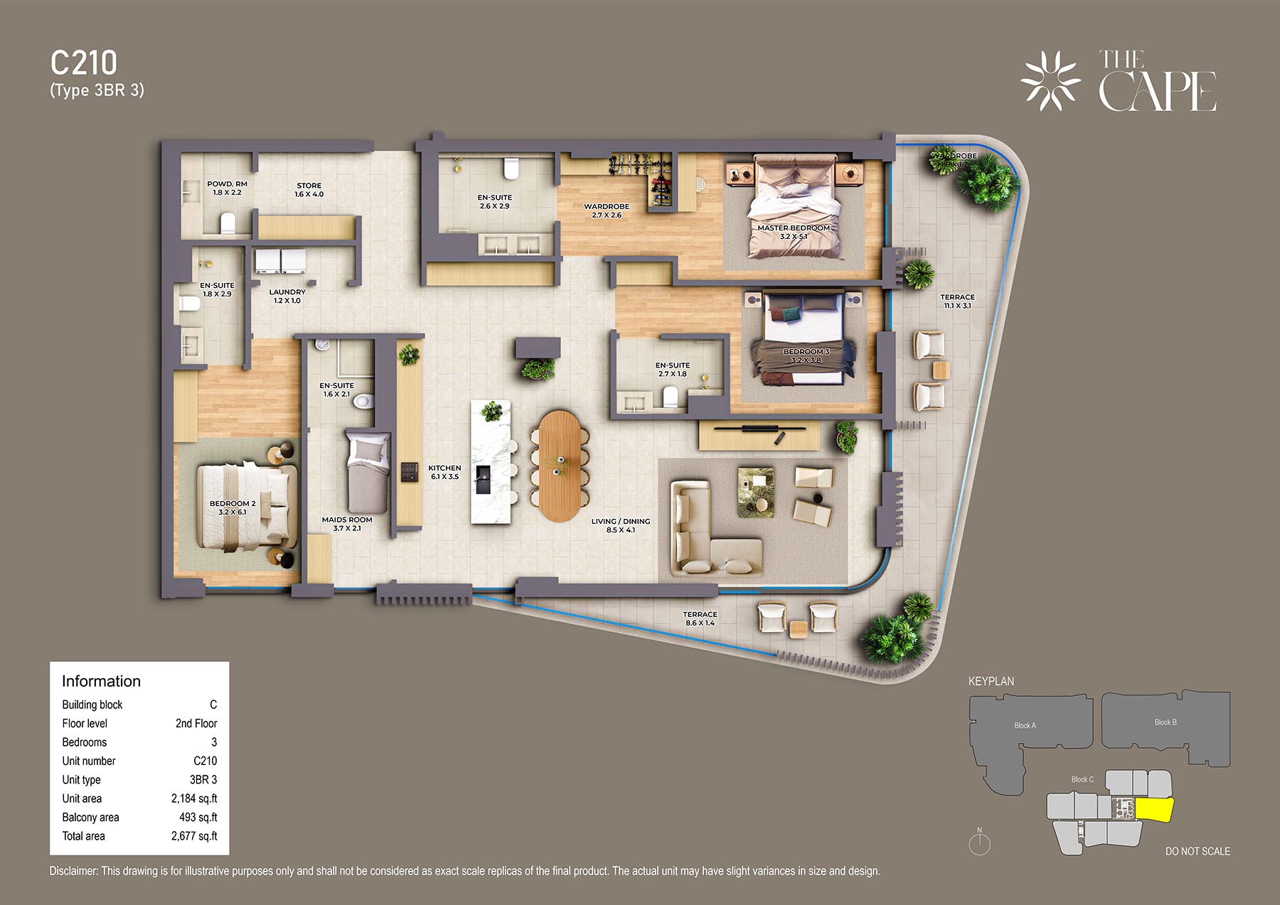 | Block C | 3 Bedrooms + Maid | 2nd Floor Unit-C210 (Type 3BR 3) | 2677.00 Sq Ft | Click Here |