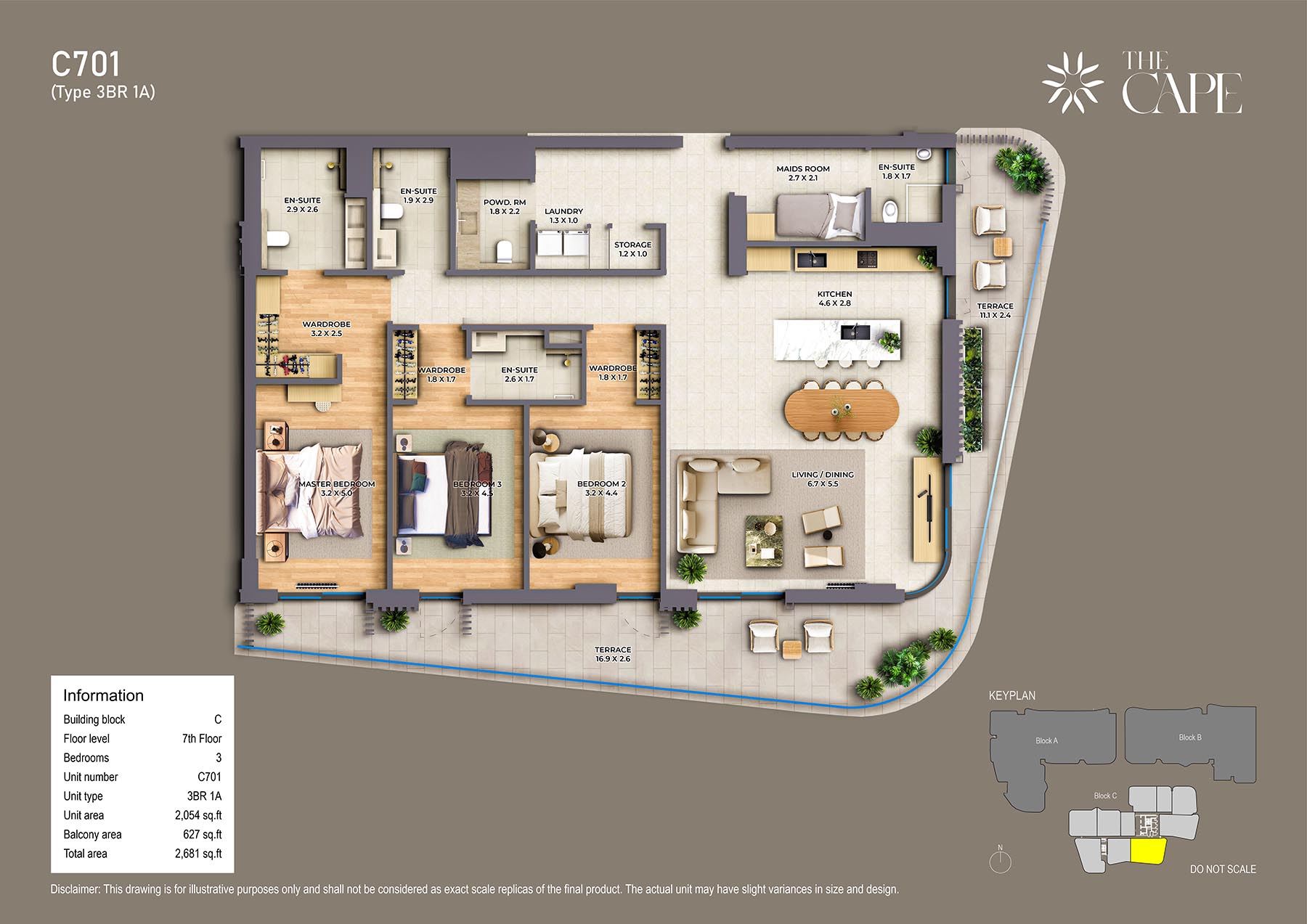 | Block C | 3 Bedrooms + Maid | 7th Floor Unit-C701 (Type 3BR 1A) | 2681.00 Sq Ft | Click Here |