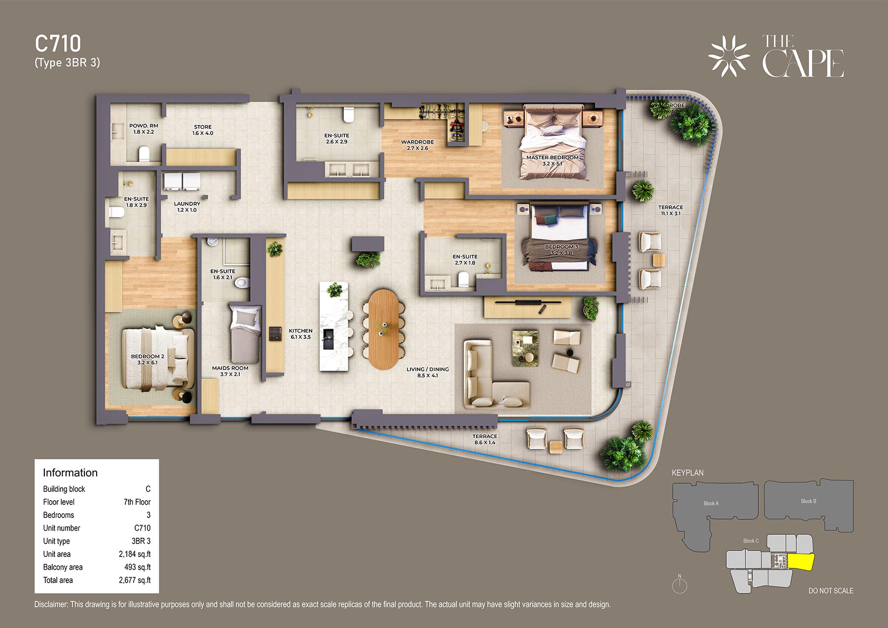 | Block C | 3 Bedrooms + Maid | 7th Floor Unit-C710 (Type 3BR 3) | 2677.00 Sq Ft | Click Here |