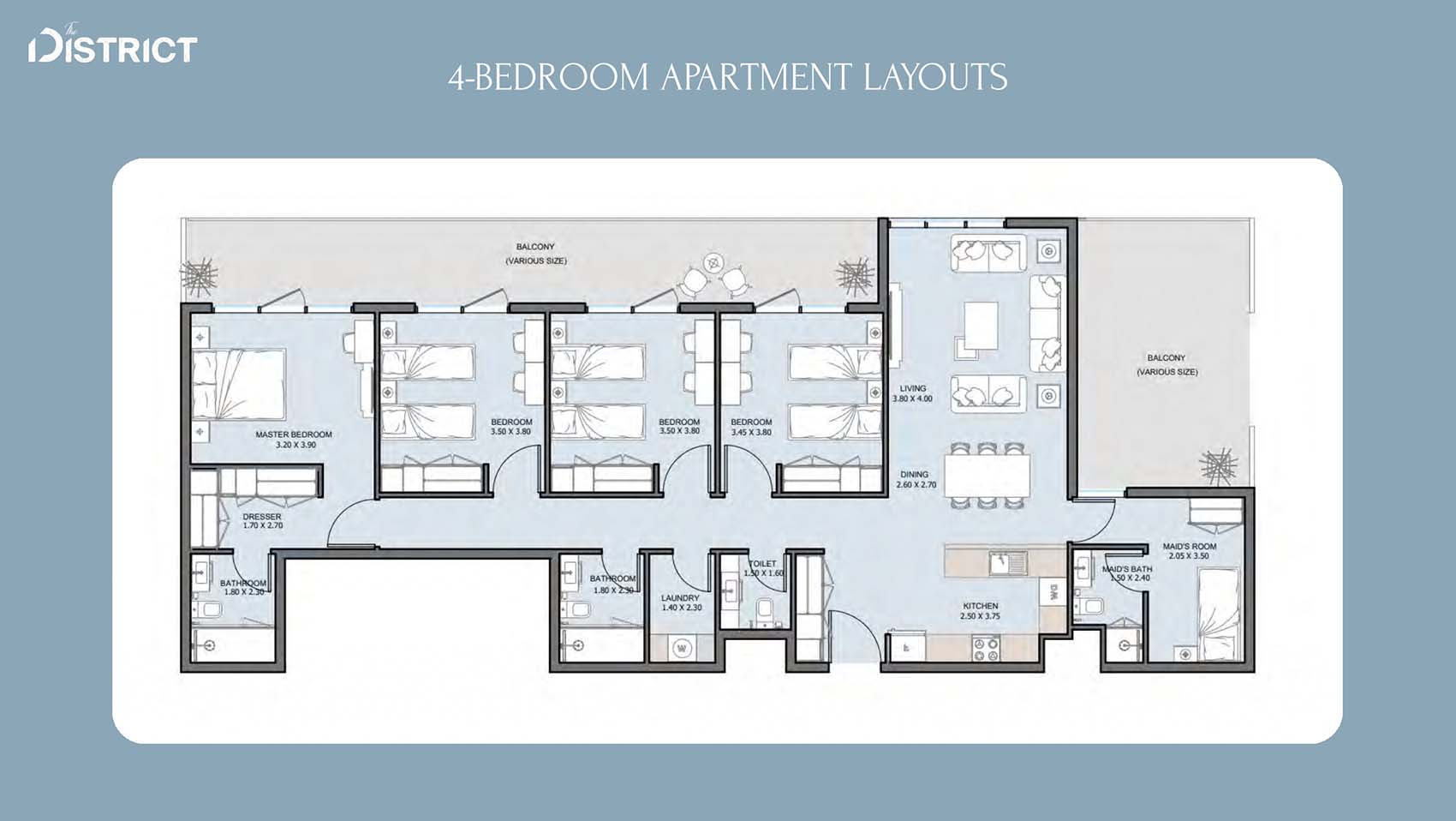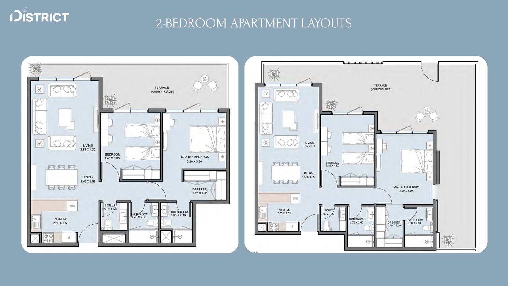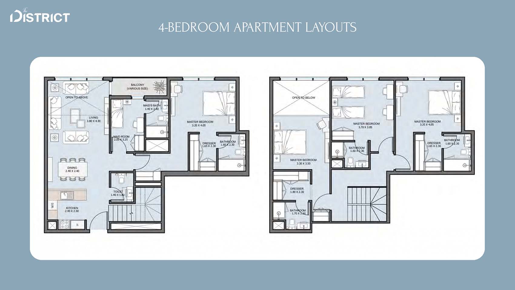 The District's floor layouts incorporate various design choices with 1 to 4-bedroom apartments, duplexes, penthouses and townhouses at ease. The residences offer open spaces between living and dining areas plus comfortable bedrooms accented with modern kitchens and room-enhancing ceilings that invite plenty of sunlight. The luxurious appeal of the properties increases with personal outdoor spaces and wide sightlines in addition to automated home technology.