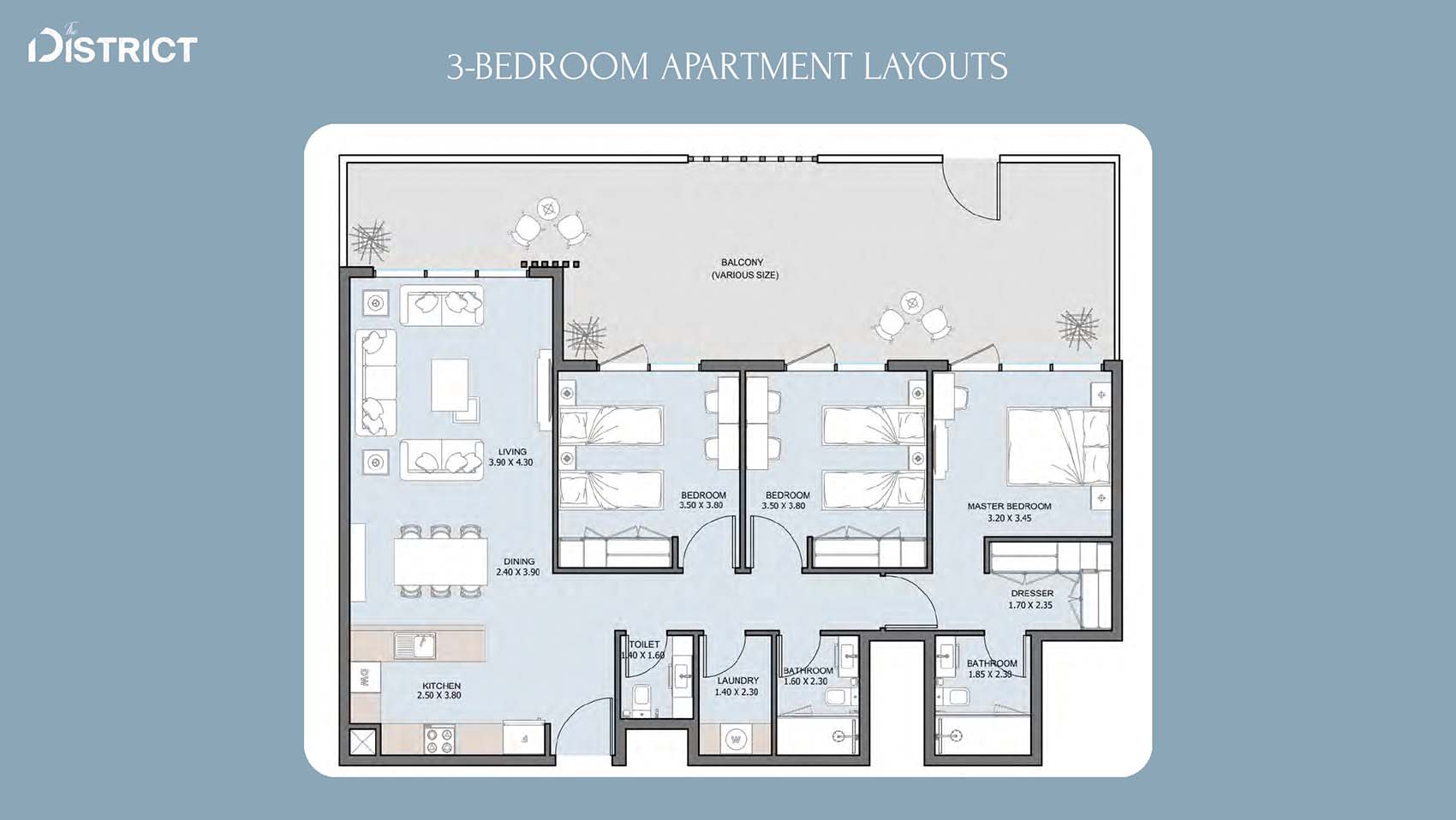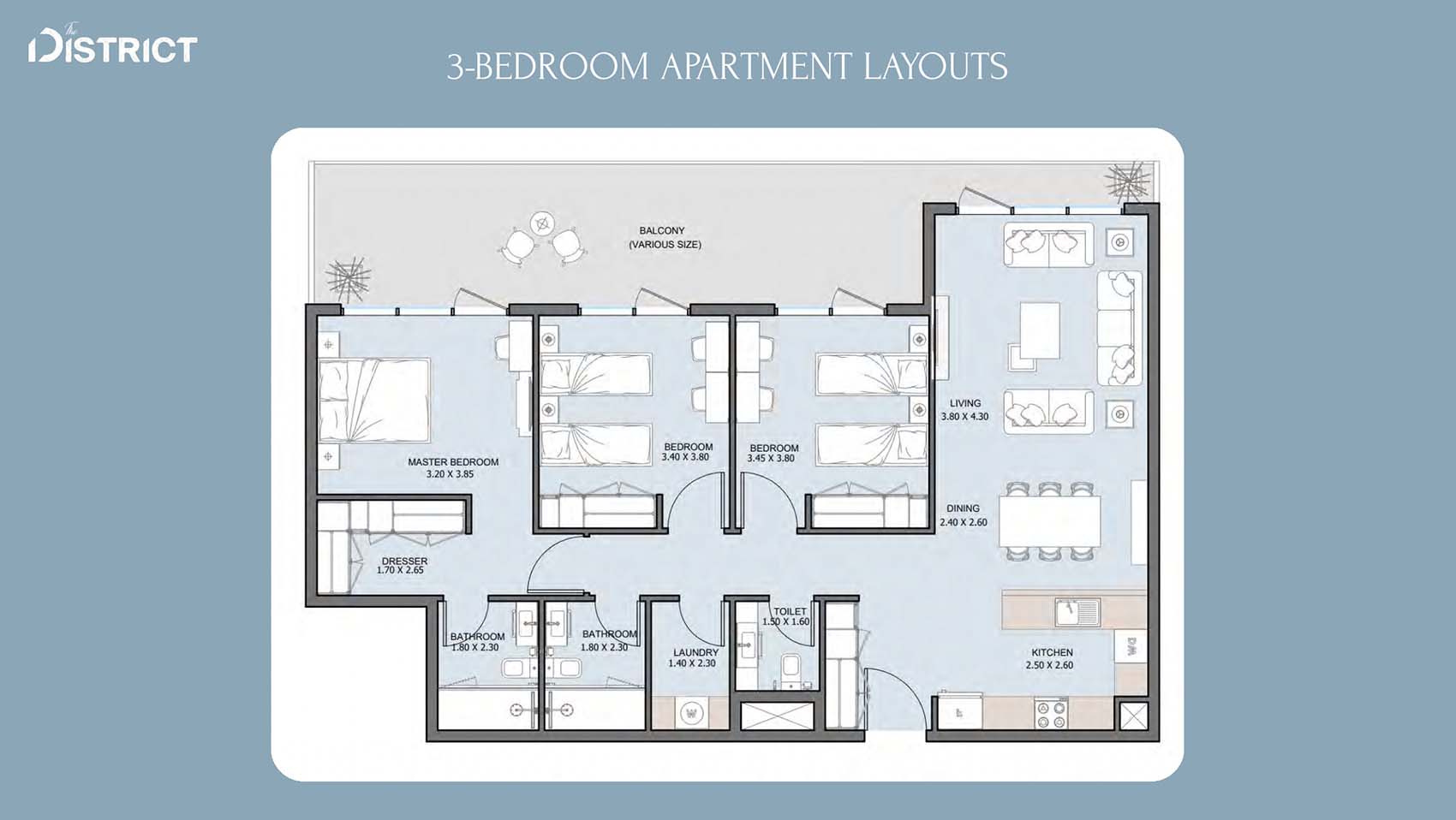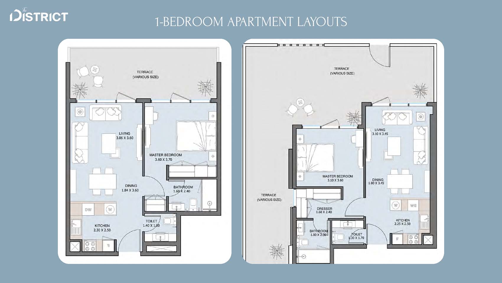 The District's floor layouts incorporate various design choices with 1 to 4-bedroom apartments, duplexes, penthouses and townhouses at ease. The residences offer open spaces between living and dining areas plus comfortable bedrooms accented with modern kitchens and room-enhancing ceilings that invite plenty of sunlight. The luxurious appeal of the properties increases with personal outdoor spaces and wide sightlines in addition to automated home technology.