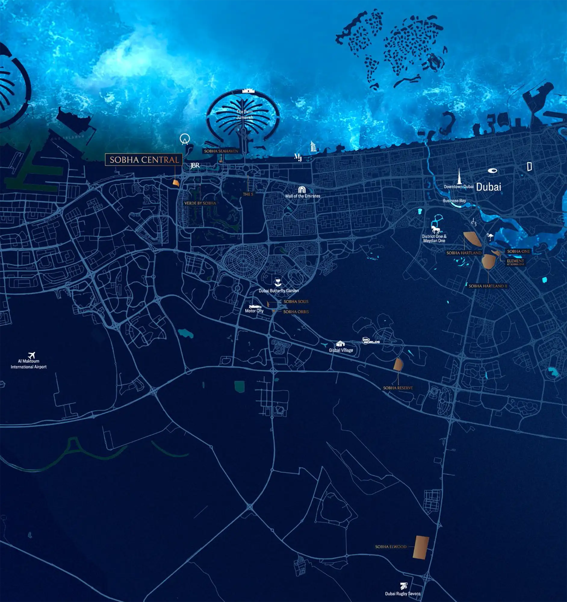 The Mirage at Sobha Central master plan is a futuristic structure of the six residential towers, all tied together with a core circulation route. It is planned as a mixed-use building and combines residential areas with a shopping centre, office and medical areas, developing an integrated urban ecosystem. The podium level contains a large park in the city-centre- on the higher pedestrian tower the level- a green oasis of leisure, recreation, and rest. The pedestrian friendly areas, planned in a very deliberate manner, make people move around whereas the sky bridges between towers give the inhabitants access to connectivity with ease. The beacon of this plan combines flowing architectural designs, landscaped calmness and dynamic lifestyle clusters, redeveloping the concept of integrated living in Dubai.