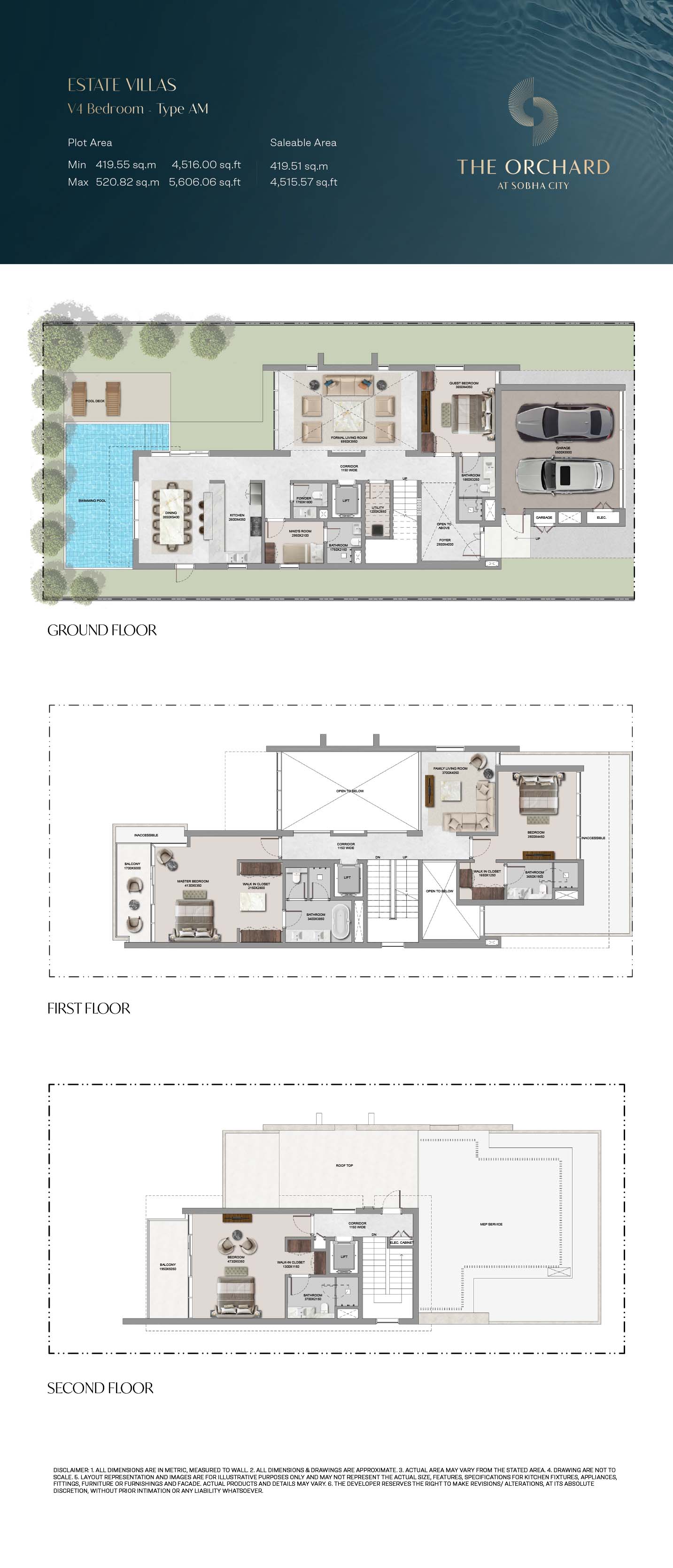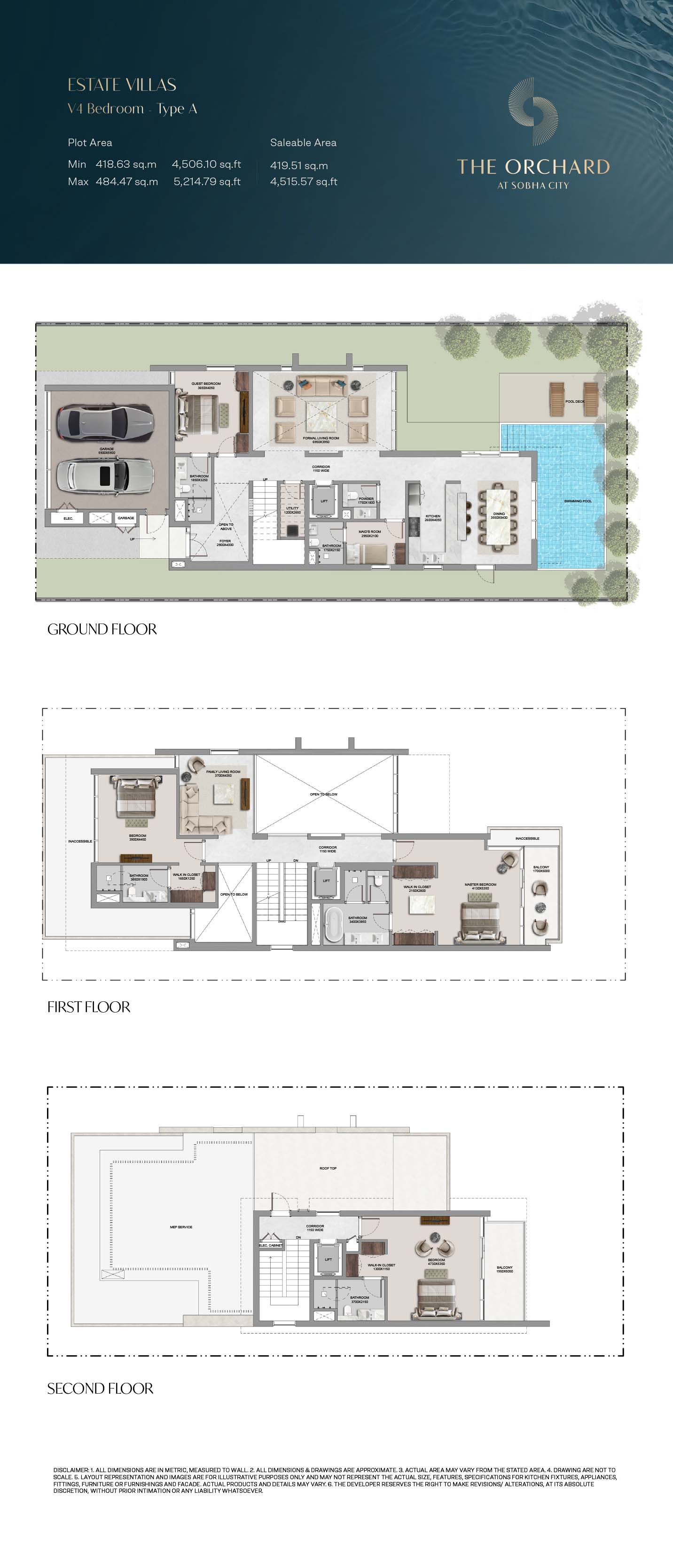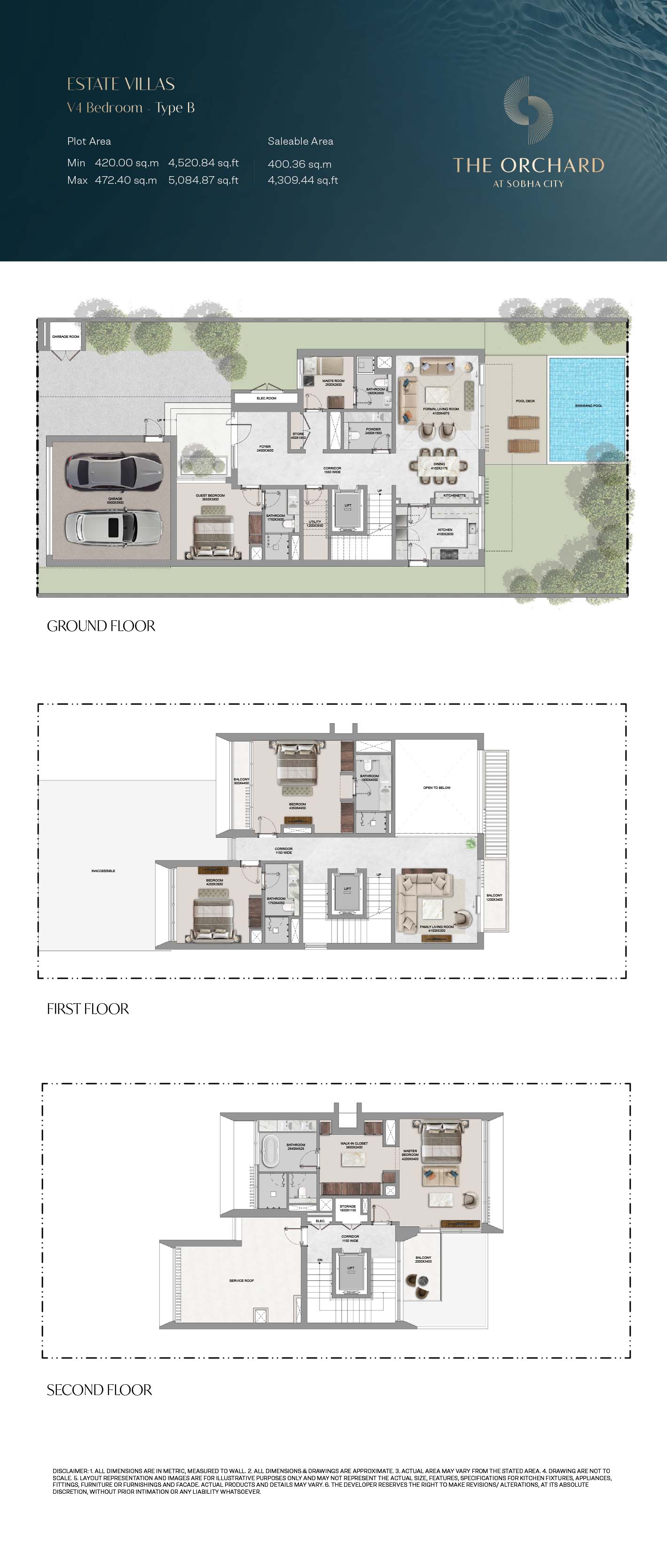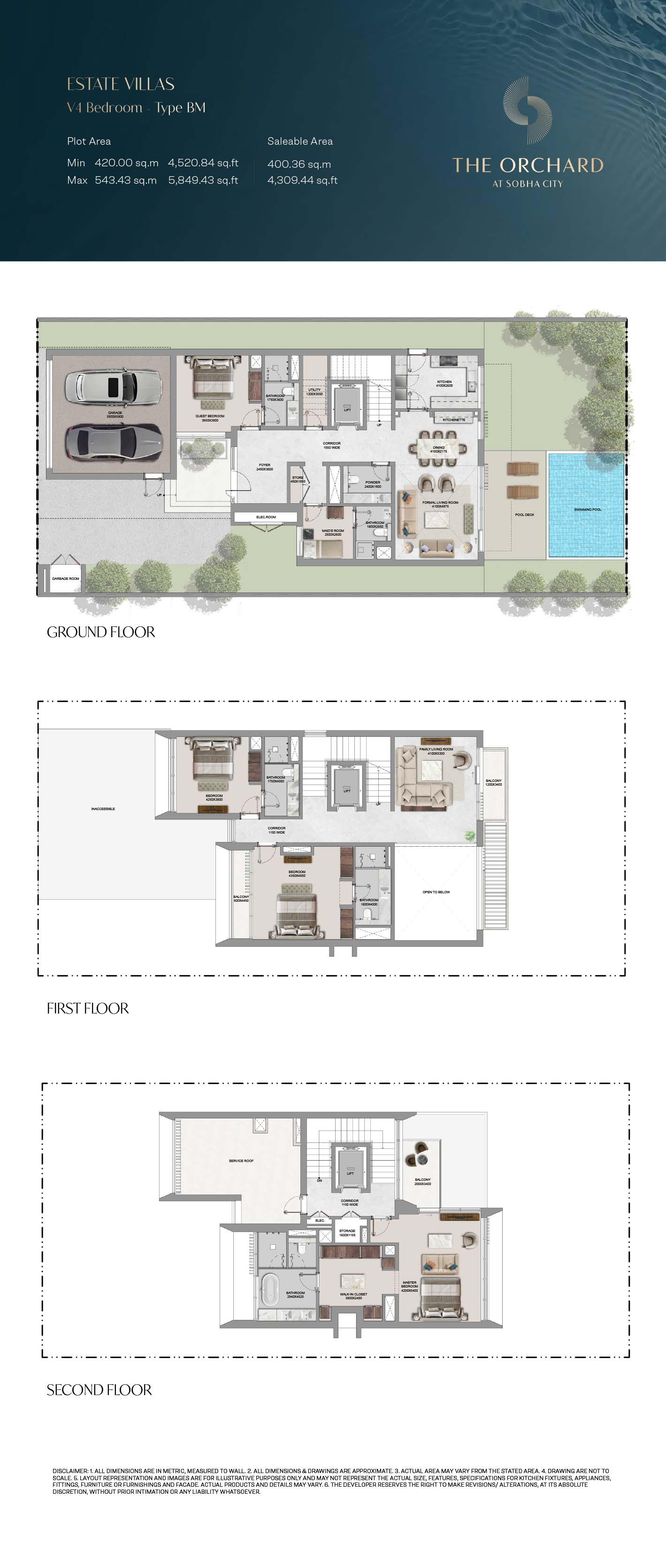 The Orchard floor plans are detailed so as to give maximum attention on space optimization, lined with 4, 5 and 6-bedroom Estate Villas. The villas have clearly separated spaces, such as large living rooms, formal and family rooms, guest suites, and bedroom suites, with a smooth transition between common and private space. There is dual height ceilings and wide size windows that contribute to greater space perception and natural light. The functional items like the lifts, utility rooms and maid quarters are cleverly incorporated to accommodate the modern life styles. Extensions outdoor, such as private pools, landscaped gardens and balconies, complement the interiors offering the entire living experience that balances between the privacy and openness.